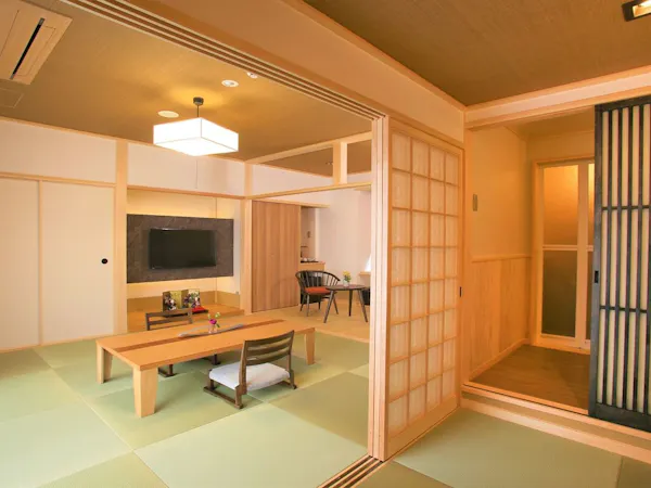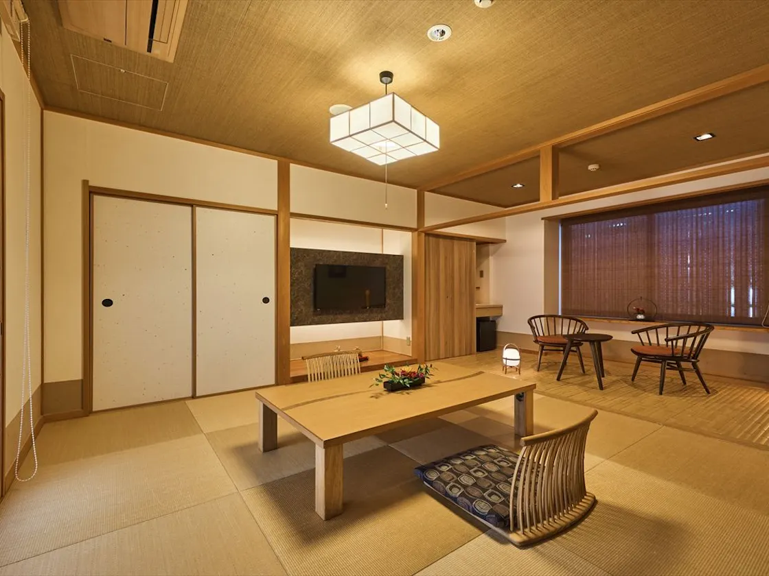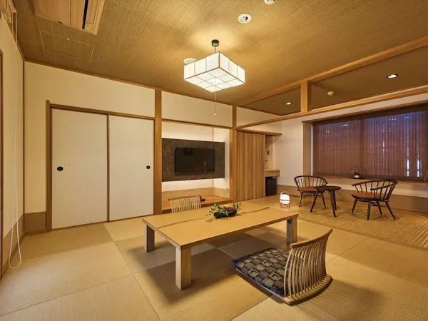 【お部屋】 踏込3帖+本間8帖+竹の間4帖+檜風呂付 自然の檜の色と香りが爽やかな印象のお部屋 【備品】 電話・液晶TV・金庫・冷蔵庫・檜風呂・トイレ(ウォシュレット)・洗面台・羽毛布団・ドライヤー・スタンドミラー・空気清浄器 【アメニティ】 作務衣・歯ブラシ・タオル・バスタオル・髭剃り・くし・シャワーキャップ・レディースセット(コットン・ヘアーゴム・綿棒)・タオル入れにかわいい巾着袋