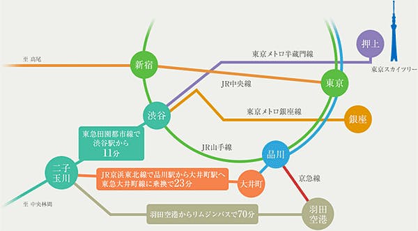 【二子玉川駅】より徒歩5分。 【渋谷駅】より東急田園都市線にて約11分。 【品川駅】よりJR京浜東北線にて【大井町駅】で東急大井町線に乗換え【二子玉川駅】まで23分。 【羽田空港】よりリムジンバスで70分。 ※詳細は公式ホームページをご覧ください。