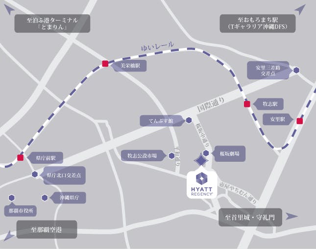 沖縄観光の中心である国際通りと歴史情緒溢れる壺屋やちむん通りを結ぶ那覇・桜坂エリアに位置するハイアットリージェンシー那覇沖縄。 那覇の台所と名高い公設市場、国際通り、壺屋やちむん通りのそれぞれに徒歩3分以内の距離でお出かけいただけます。観光の拠点として好立地でありながらも、繁華街からは少し入った落ち着いた一角に位置しており、ハイアットならではの優雅なホテルステイとローカルの魅力体験を思う存分ご満喫頂けます。 那覇空港からお車で約20分、ゆいれーる「牧志駅」より徒歩7分と、ビジネスでご利用いただく場合にも最適なロケーションです。 沖縄の文化と歴史を尊重し、随所に琉球文化の魅力をちりばめた「沖縄の風と水を感じる」をテーマとした空間で贅沢なご滞在を演出します。
