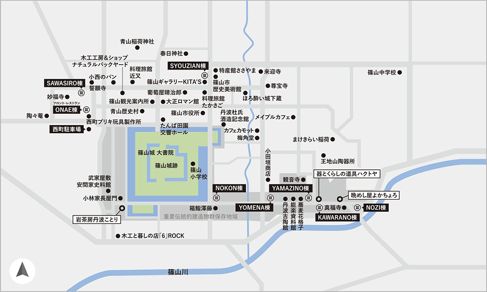 丹波篠山にゆかりのある菊の名前がつけられた7つの客室棟は、城下町に散らばっており、1つとして同じものがなく、どれも個性豊かな佇まいです。一棟貸切や家族数世帯で貸切できる客室棟をはじめ、 1棟あたりの客室数が5室以下のため、ゆったりとプライベート感のある滞在をお過ごしいただけます。 歴史的建造物には、長い時間をかけて積み重ねてきた日本独自の暮らしや文化、歴史的な空間の力強さ、そして地域ごとの特色が詰まっています。古くなったから手放すのではなく、地域の宝を出来る限りそのまま活用するサステナブルな取り組みであることから、泊まっていただくことで地域活性化にも貢献していただけます。 フロントとレストランのあるONAE棟でチェックインを済ませたら、歴史的情緒あふれる町並みを楽しみながら各お部屋へお進みください。(最も離れている棟はフロントのONAE棟から約2キロ。離れた客室棟まではスタッフが車で送迎させていただきます。)まちを回遊することで生まれる、泊まらなければ出会わなかった偶然の出会いや、地域住民の方とのコミュニケーションも旅を一層豊かなものに。まちに溶け込み、暮らすように過ごすことで、他では体験できない篠山城下町の文化をお愉しみください。