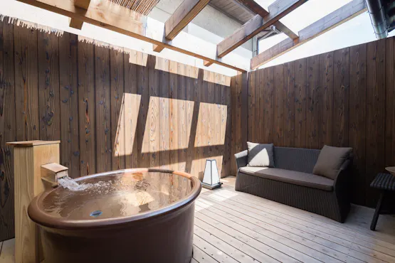 全室半露天または露天風呂を完備。茶の香りに癒される至福の湯浴みを堪能