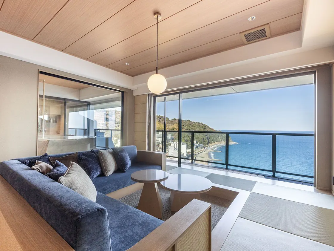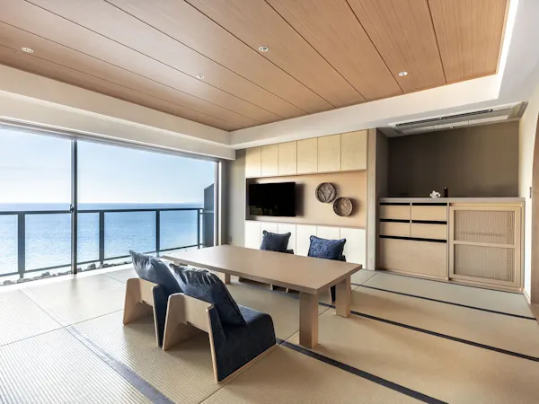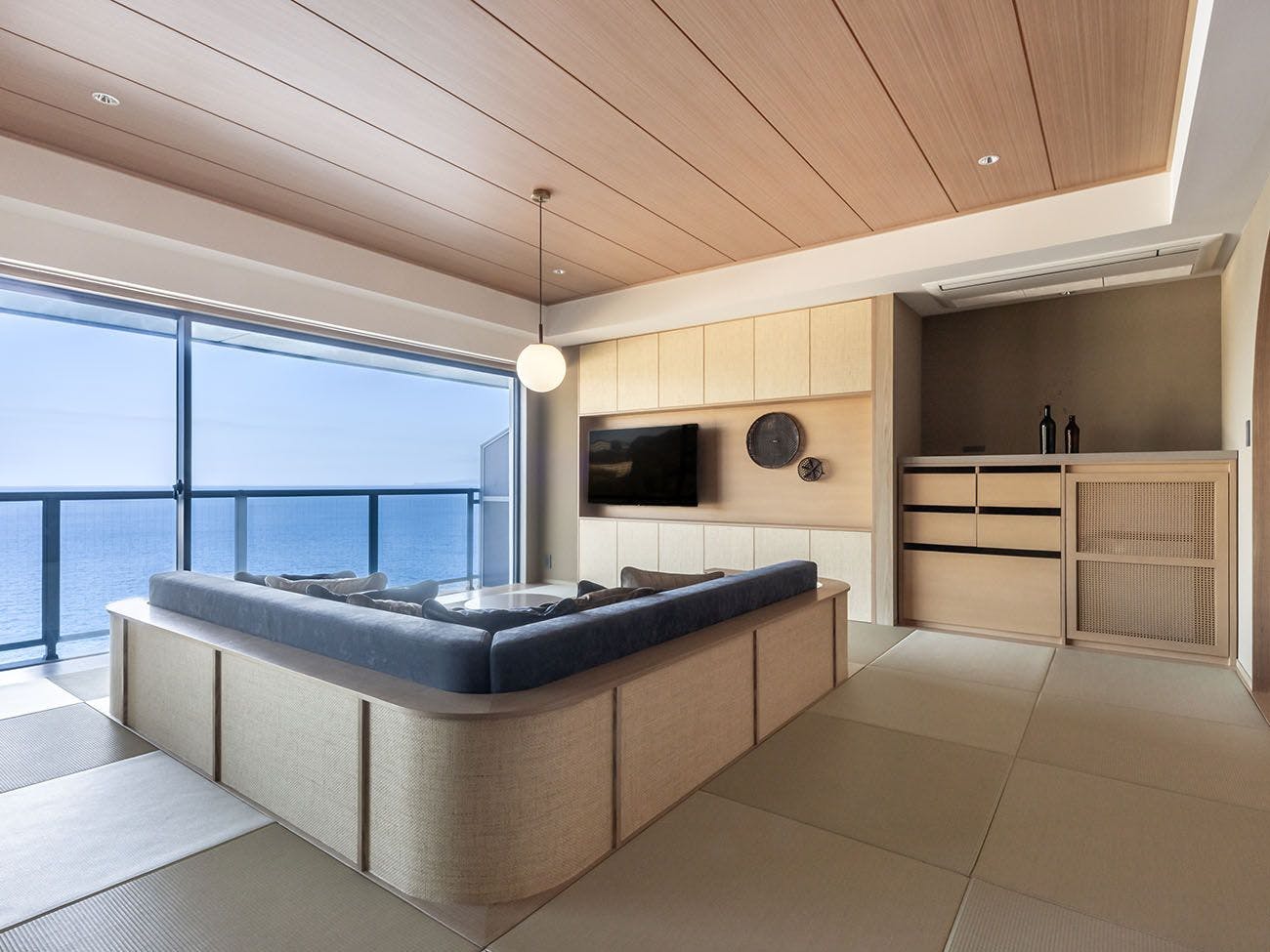 美しい海の開放感と和と洋が調和する、心安らぐ客室 湯上がりに畳の上でリラックスできるのもこの客室ならでは 東伊豆の海を一望する専用露天風呂と共にお寛ぎください。 ■階 数:4F~6F ┗ 客室は、椅子&テーブル または掘りごたつ式※客室指定不可 ■平米数:104平米 ■寝 具:120cm×200cm×2台 3名様以上でご利用の場合、ソファベッドまたは お布団をご用意させていただきます。 ■温 泉:源泉掛け流し露天風呂 (ホテル内に大浴場のご用意はありません) 【お子様同宿可】 ・小学生は大人に準じたお料理をご用意いたします。 →お子様ランチをご希望の場合は食事内容の変更が可能 ※要事前予約 料金は変更出来ません。 ・子供区分 小学生:7~12歳 乳幼児食事寝具利用:4歳~6歳 乳幼児食事寝具なし:1歳~3歳(施設使用料5,500円) お食事をご希望の場合、お子様ランチ|一人11,000円(税込み)※要事前予約 0歳(無料)→備考欄に0歳児のお子様がいる旨、記載をお願いします。