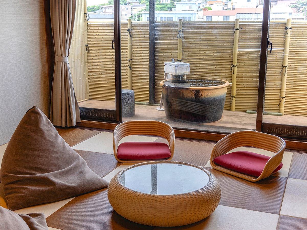 全7タイプの客室中4タイプ「温泉露天風呂付客室」を展開しております。 お部屋にいながら、<保温効果が高く冷え性>に効果的な伊豆稲取温泉をお好きなタイミングで何度でもお楽しみいただけます。