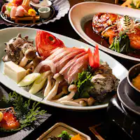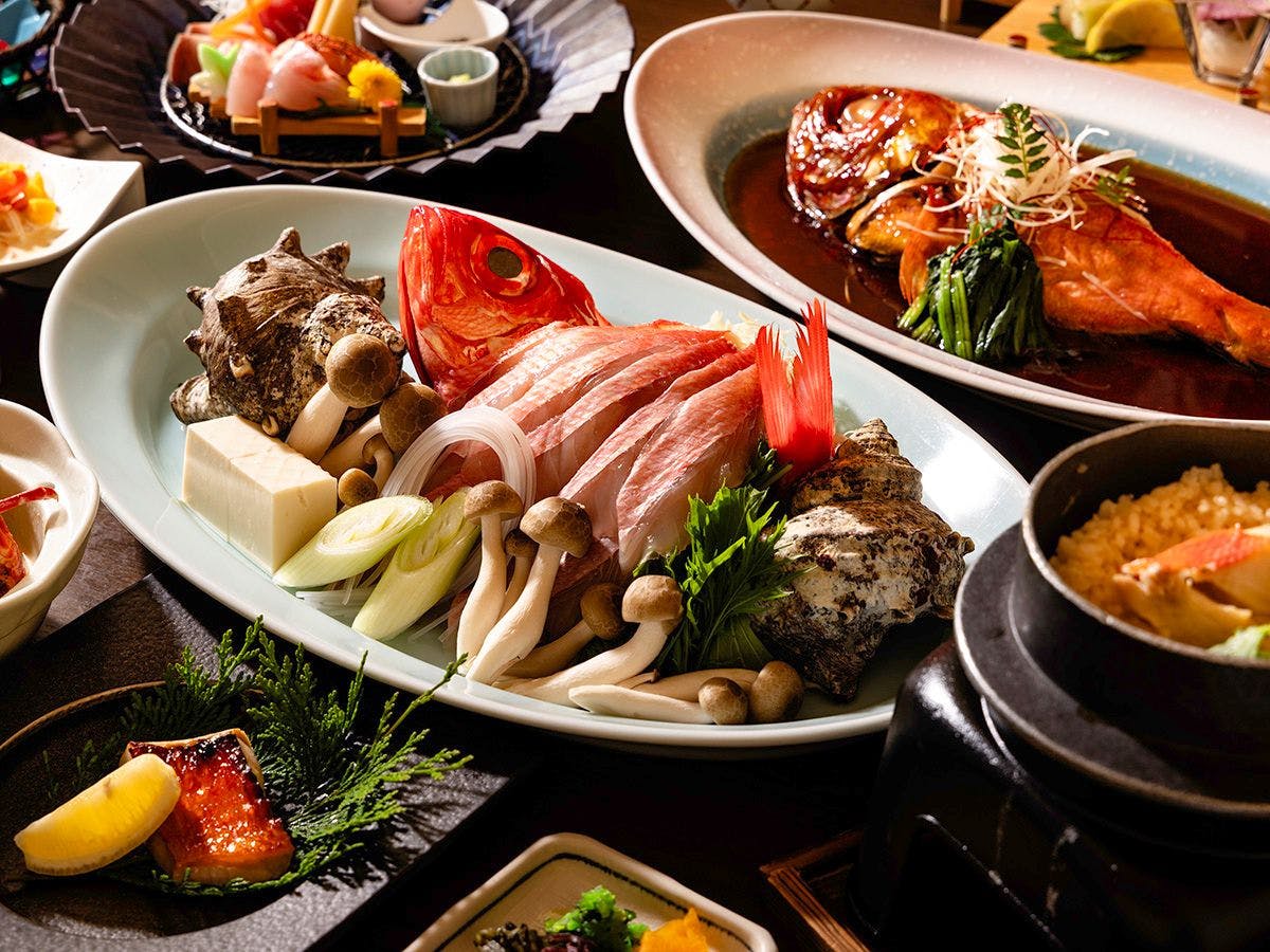 毎朝、近郊の漁港に水揚げされる新鮮抜群の「海の幸」を中心に料理人がこだわった逸品で紡ぎだす、会席料理の数々――。 当館自慢の名物料理は、やっぱり【金目鯛の姿煮】 <姿のままのご提供>が特徴です。 丸ごとだからこそ味わえる「大ぶりな身」を 料理人が何年もかけて継ぎ足した「秘伝のタレ」で仕上げております。 SAZANAの食の匠が腕によりをかけて仕立てたお料理の数々を「海の見えるレストラン」でごゆっくりとお召し上がり下さい。