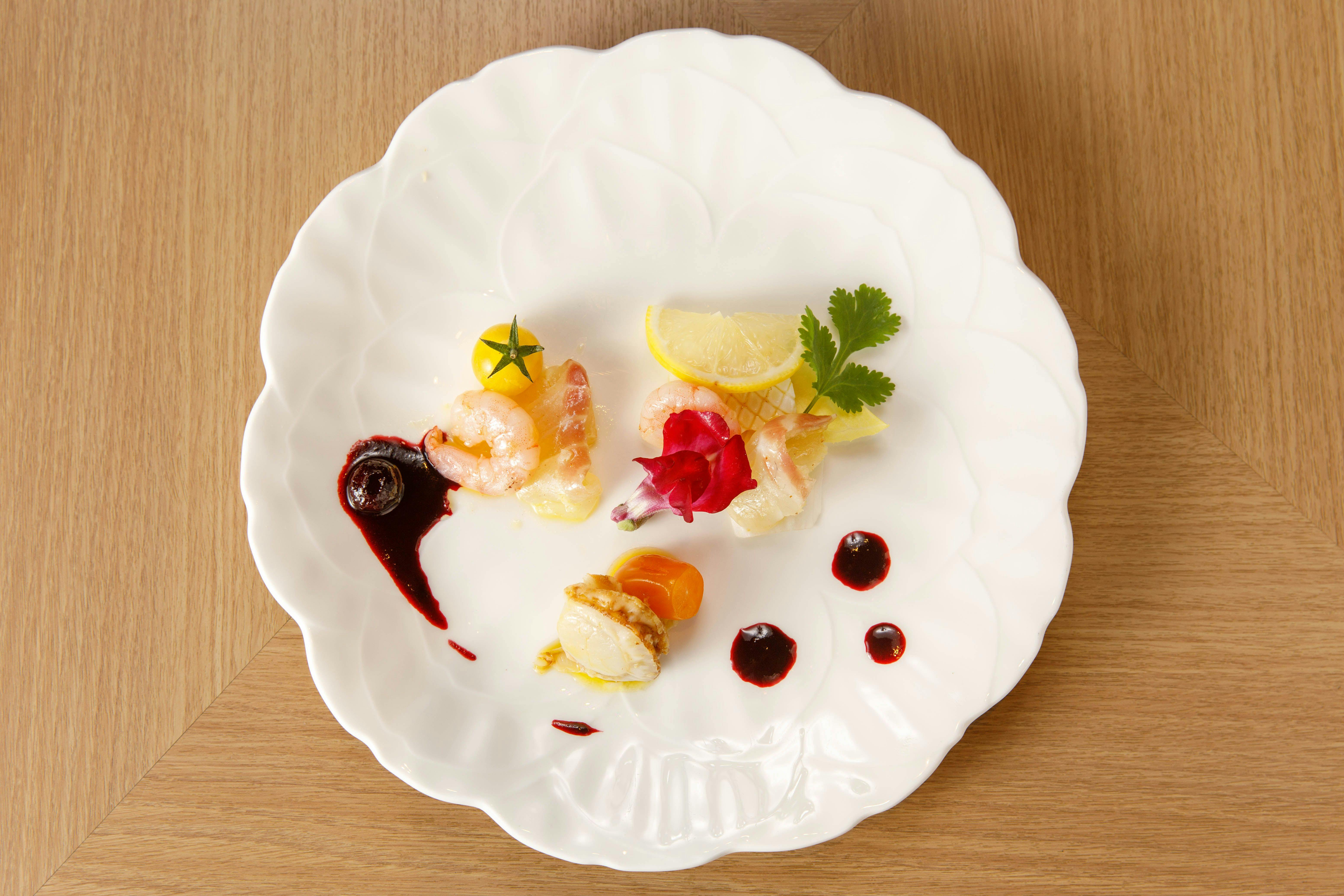 厚生労働大臣賞受賞の経歴を持つ料理長がご用意するお料理は、全て出来立て。オーダーをいただいてからつくる厳選アラカルト。 目の前であなただけの“ひとさら”をご用意いたします。あなただけのコース仕立てのお料理を、好きな順番で何度でもお楽しみください。 豊富な地酒や厳選ワイン、地元果汁ジュースなどお料理と一緒にフリーフローでお楽しみいただけます。