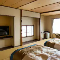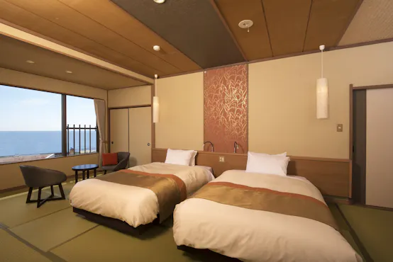 和の伝統美と、洋のモダンさを融合しました。畳のぬくもりの中にツインベッドを備えた、どこか懐かしくも新しい、癒しの空間です。美しい伊豆の海を眺めながら、特別なひとときを。