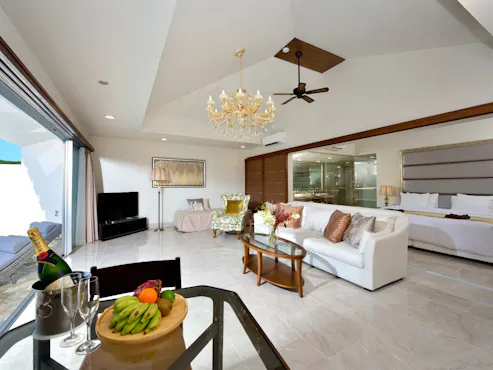 心地よいひとときを約束する 華やかな非日常空間 ヴィラの窓を開けると、リビングとプライベートルームがひと続きになり、碧く澄んだイムギャービーチを臨むことができます。 朝日から夕陽まで、ずうっと海を見ながら過ごせる日々。イムギャーパレスで過ごす心穏やかな休日を。