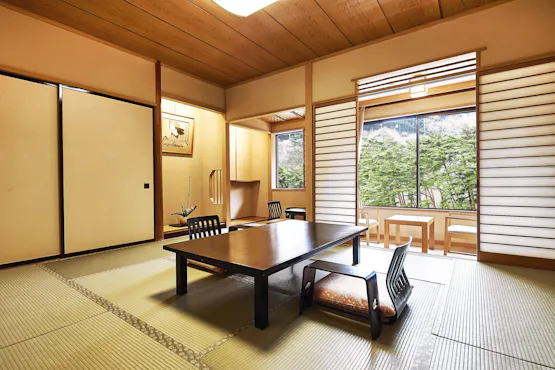 ゆったりと心癒される空間。「湯けむりの里 柏屋」のお部屋は、自然の風景に抱かれております。山と川とが織りなす風雅な景観に、心やすらぐひととき。自然を愛でながらくつろぎ、日々のあわただしさを忘れて心ゆたかな時間をお過ごしください。