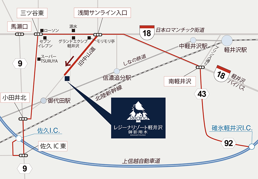 ●上信越道碓氷軽井沢I.C⇒県道43号⇒国道18号(日本ロマンチック街道)⇒浅間サンライン入口信号左折 道なり約1キロ⇒レジーナリゾート軽井沢御影用水
