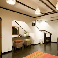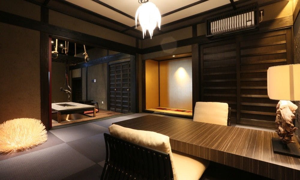 美しい和モダンの落ち着きと、木の温もりを感じるお部屋です。一棟ごとに、時代、文化、趣味趣向の異なるテーマを設け、心地よいサプライズを盛り込んだ造りです。ゆったりくつろぎながらも、笑顔と感動に出会える空間に仕上げました。