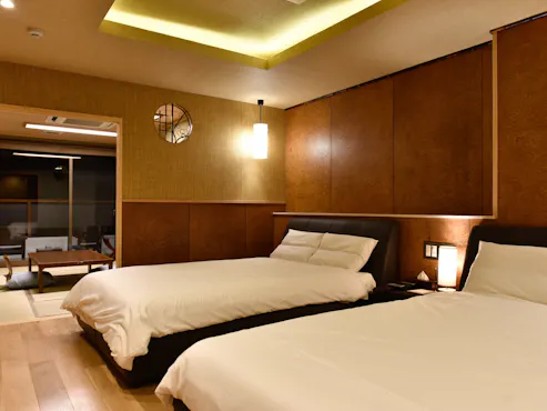 心地よい藺草の香りがやさしい畳の和室と、重厚で心地よく包まれる上質な欧州家具。 非日常のようでどこか懐かしさを感じさせる寛ぎの空間。 何もしない贅沢を味わい、天然の源泉をたっぷりとかけ流した神秘の湯に身をゆだねる。