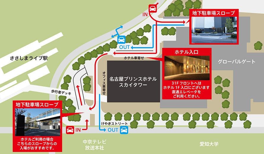 ■名古屋駅からのアクセス あおなみ線にて1駅3分「ささしまライブ」駅直結 JR名古屋駅 桜通口より徒歩17分 ■タクシーでお越しの場合 JR名古屋駅 桜通口または太閤通口(新幹線口)より約7分 ■お車でお越しの場合 東京方面から 名古屋高速5号万場線 黄金I.C.から平常時約6分 大阪方面から 名古屋高速5号万場線 烏森I.C.から平常時約10分 カーナビゲーションで郵便番号を検索される場合は、〒453-6190(グローバルゲート)で検索をお願いいたします。 名古屋プリンスホテル スカイタワーのフロントは、グローバルゲートの31階です。 ※駐車場については下記駐車場情報をご覧ください。