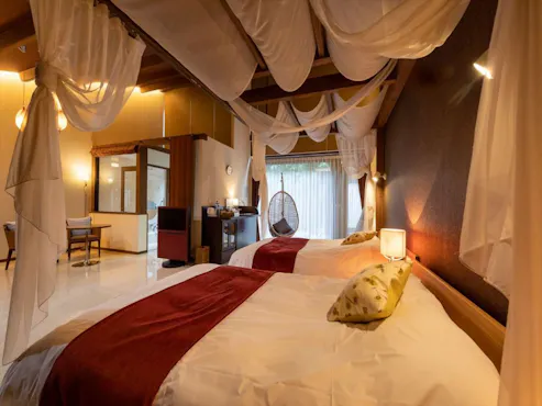 それぞれ異なった趣向が凝らされた8つのお部屋が緑豊かな敷地の中に点在するリゾート空間です。 贅沢なお宿で穏やかな時間がお過ごし頂けます。