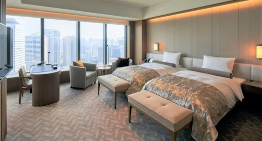 機能と情緒を愉しむ。 オークラ プレステージ プレステージタワー 28階~35階(禁煙フロア)に配置された客室。 手すりやパラマウント製電動ベッドなど、バリアフリー対応の設備を備え、安心してご滞在いただけます。 浴室より地上約120~190mからの景色を一望しながらゆったり寛げるビューバスタイプ。東京の今が一望できる大きな窓からは、東京タワーもご覧いただけます。 ■バスアメニティ ・シャンプー、コンディショナー、ボディソープ、ボディミルク、固形石鹸、バスソルト ・THREE(クレンジングオイル、ソープ、ローション、エマルジョン、クリーム、オーガニックコットン) ※ベッドはハリウッドスタイル(120cm×2台)となります。 ※眺望、階数のご指定はできませんので、あらかじめご了承ください。 ※エキストラベッドはご利用いただけません。 ※画像はイメージとなり、実際の内容とは異なる場合がございますのでご了承ください。