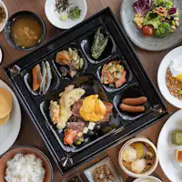 躍動感のあるライブキッチンからこだわりの和洋ブッフェスタイルの朝食を提供します。日本の伝統的な櫓組を彷彿させる梁が印象的な日本酒バーエリアと個室を完備し、厳選した日本酒とともに、素材を生かしたこだわりの料理とのペアリングをご堪能いただけるダイニングです。