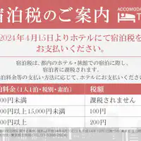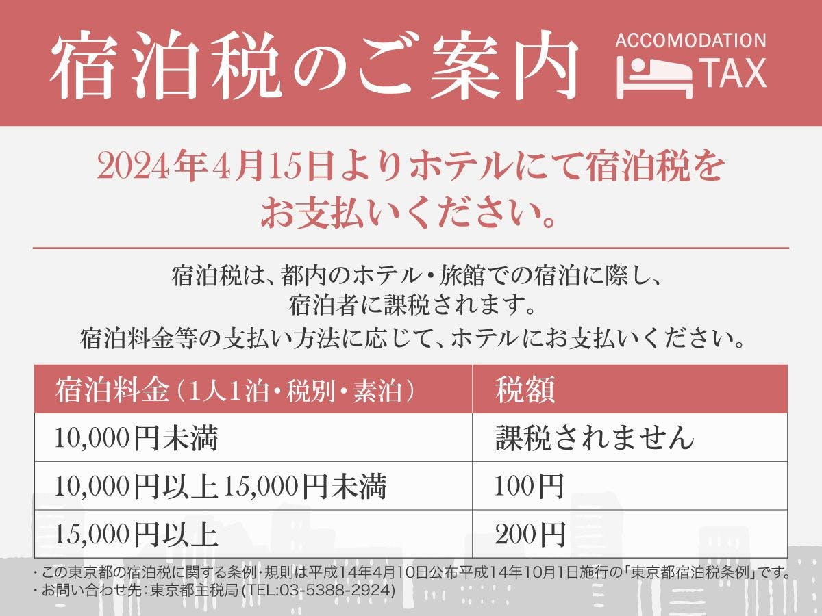 | 税金 | 東京都内のホテルでは、宿泊税が別途課税されております。 10,000円未満 課税されません 10,000円以上15,000円未満 100円 15,000円以上 200円 ※宿泊税は、お1人様ご1泊の宿泊料金に対する税金です。 |