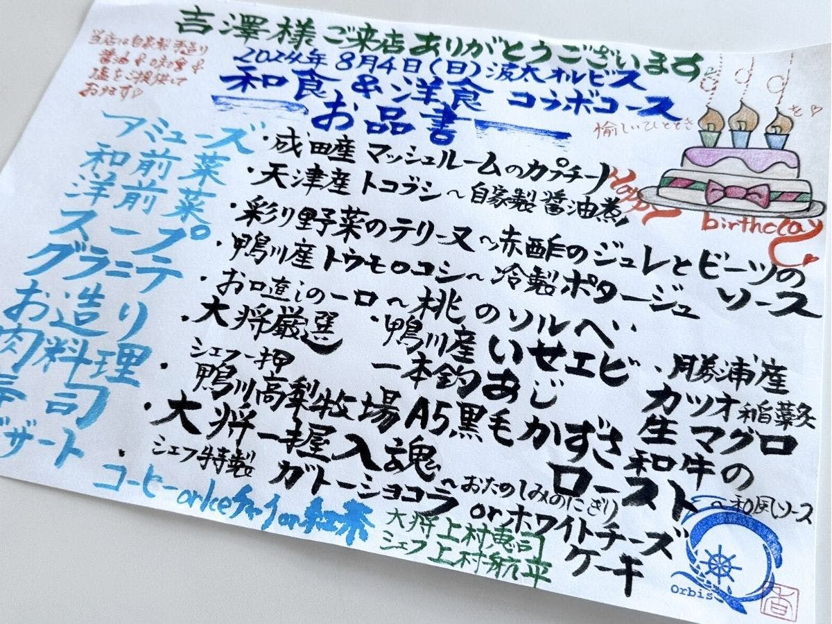 彼の誕生日旅行でお伺いしました。無料でお部屋の飾り付けやメッセージカードの作成をしていただけました!他のクチコミにもある通りホスピタリティが高く、よくお客さんの事を見てくれているのが伝わってきました。お料理を出すタイミング、お皿を下げるタイミングが理想的過ぎてとにかく凄かったです。ノンストレスで大満足な食事の時間を過ごせました。お料理の内容もとても素晴らしく、まさに泊まれるレストランでした。名物、女将さん手書きのお品書きもいただけて嬉しかったです。お料理や窓からの景色が季節ごとに変わる四季を楽しめるホテルだと思うので、今回は冬にお伺いしましたが、また別の時期に行きたくなりました!彼も帰る前から、また来たいと言っていました笑帰り際、手を振ってお見送りしていただけたのも嬉しかったです。素敵な時間をありがとうございました!