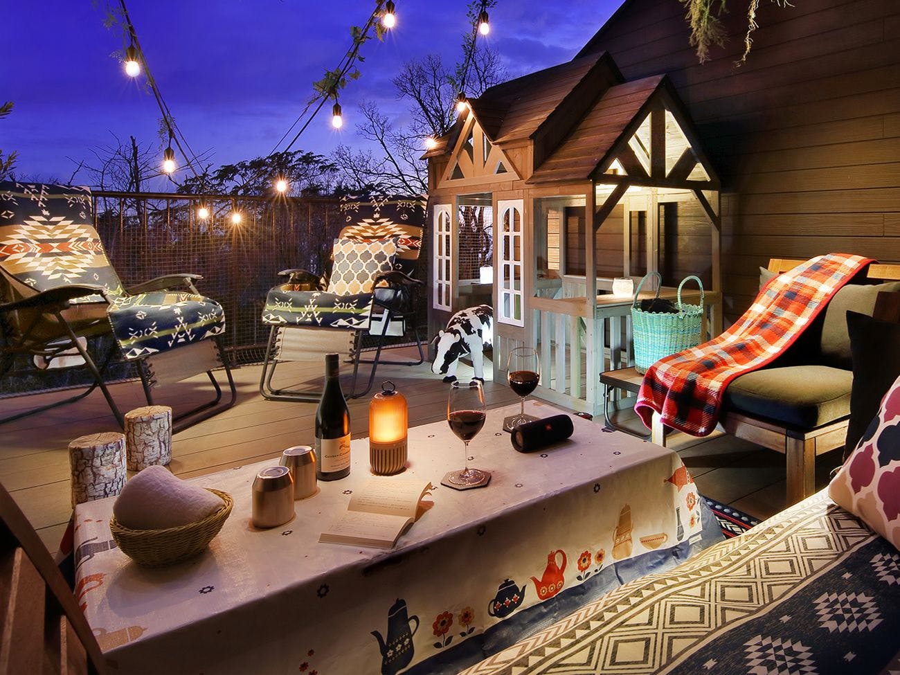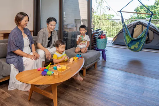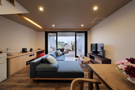 全室1階にはプライベートバルコニー付き。ソファやハンモックを設え、アウトドア感覚を楽しめます。501号室、505号室にはグランピング風のデコレーションを施しています。