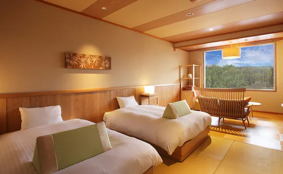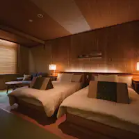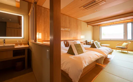 季節を感じる中庭を眺めながら、外廊下を伝ってご移動いただく「木もれび離れ館」と、蔵王山麓の稜線を眺めるモダンスタイルの「さくら館」。上質なマットレスや選べる枕など、朝までぐっすりお休みいただけるこだわりの寝具をご用意しております。