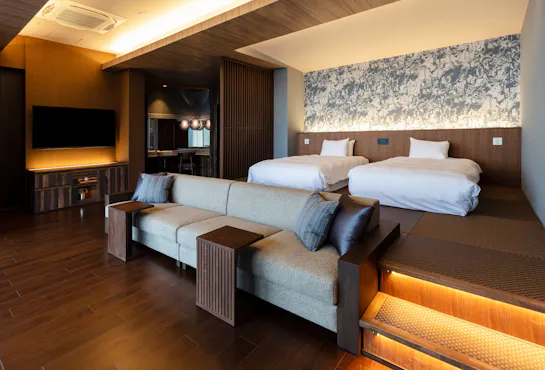KIARAのお部屋は、浜名湖の景色とともに過ごす時間を主役に設計されています。 全室レイクビューの窓辺に立つと、時間帯ごとに表情を変える湖の風景が広がり、滞在中のリズムまでも自然に緩やかに整っていきます。 インテリアは過度な装飾を抑え、静けさと落ち着きを大切にした設え。 滞在スタイルに合わせた心地よさをご用意しています。 湖を眺め、深く息をし、ただその場に身を置く。 そんな“何もしない贅沢”を、安心して受け止めてくれる空間です。