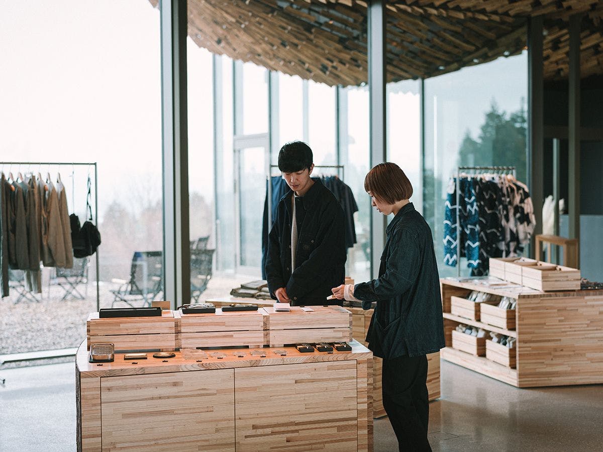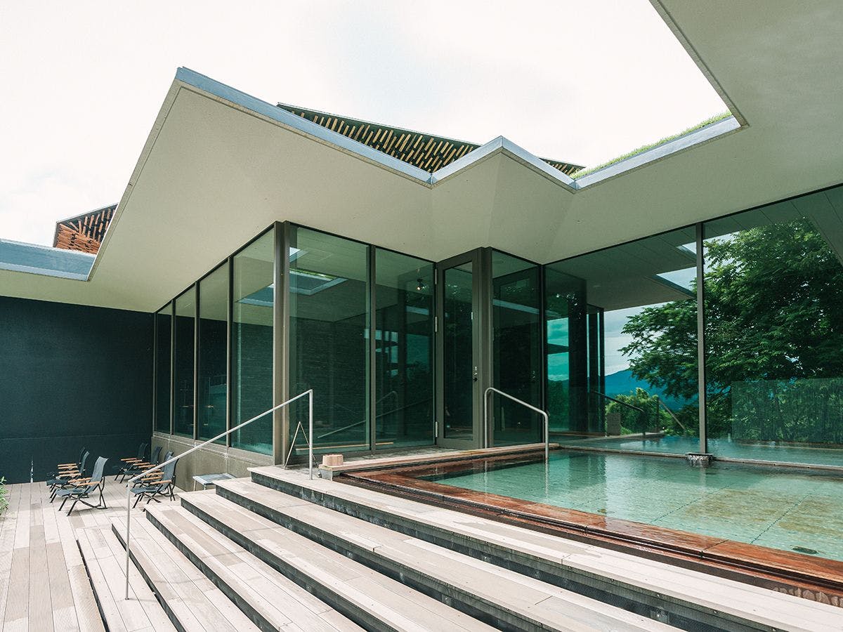 粟ヶ岳を望むロケーションから生まれた、野性味のある山並みのような設計は、世界的な建築家、隈研吾氏によるもの。 訪れる方々をお迎えする軒裏は、焚火に不可欠な薪をイメージしています。 館内に使われる土壁や木材は、すべて地元新潟の自然の恵みから生まれ、下田郷の自然と四季に溶け込むかのよう。