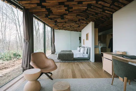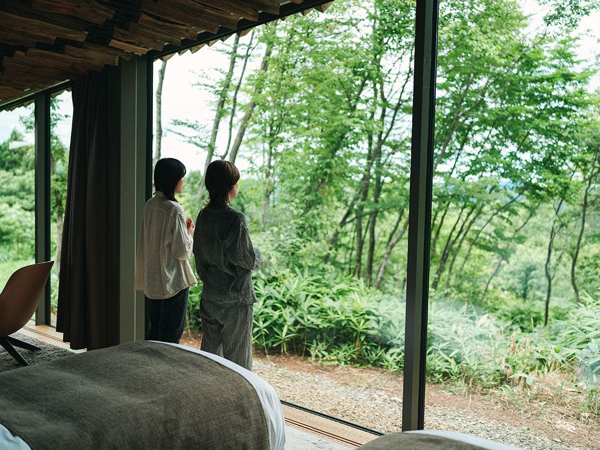 自然と溶け合うロケーションで、自然と自分をみつめる時間を。 まるで自然の中で過ごすかのように、四季の自然と時間の移ろいを体験いただけます。 春夏秋冬に移ろう色とりどりの景色に満たされて、自然とゆっくり溶け合う体験を。