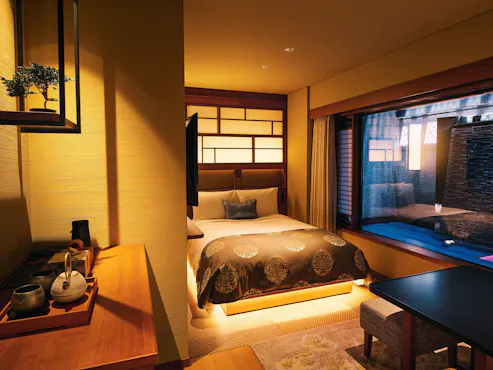 京都河原町駅徒歩1分。敷地内地下1,100mから汲み上げる全国屈指のマグネシウム豊富な温泉を、無添加の状態で全部屋の露天風呂に充しております。和モダンの静寂なお部屋で、優雅に何度も温泉に浸かりお寛ぎください。 東山連山を借景とした別邸専用ラウンジでのチェックイン後は、足湯付きの空庭テラスで移り行く鴨川を眺めての1杯。 最上階露天風呂では心身を健やかに保ち美肌にみちびく成分が多量に含まれた1.2mの深湯天然温泉と、美肌効果抜群のマイクロバブルを発生させたシルキーバスが体を優しく包み込みます。 割烹東山では四季折々の食材で彩られた創作京会席をご用意。別邸専用の数寄屋門からは路地を抜け、高瀬川を渡り先斗町や祇園へもすぐ。 アトラクションは街。京都の真ん中を楽しみながら、上質なプライベートステイを叶える。「新しい宿」からはじまる「新しい京都旅」をご堪能ください。