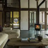 敷地内には四季折々の自然の薫りが漂い、自然の風化で錆びた鉄の重厚なゲートをお楽しみいただきながら古民家の玄関に入ると、そこからSHIGUCHIの別世界が広がります。大自然のパノラマが一望できる窓からは、時間の経過とともに表情を変える一枚絵さながらの景色が、心を潤わせてくれます。オークや檜の太い梁で支えられている古民家の架構をはじめ、廃材を使用した引き戸やドア材、柱の継目に施された鉛の金継ぎなど絶えず変化し循環する自然への敬意をこめて、自然と人のつながりを取り戻す空間を体感していただけます。