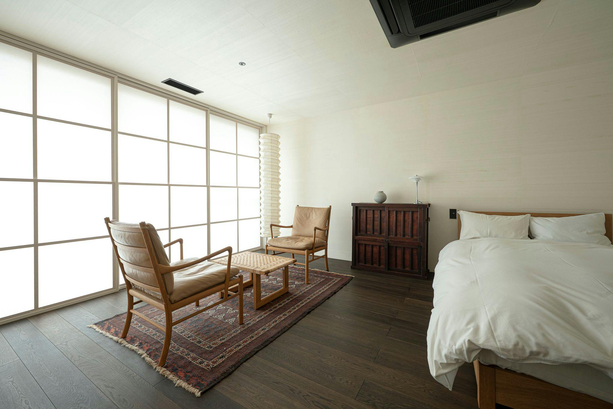 三方を水田に囲まれた築120年のアズマダチを再生。紙、絹、土。呼吸する、自然の力が宿る素材たち。 それらを使用した全3室の客室は環境と切れ目なくつながり、風景、アート、インテリアと心地よく調和します。