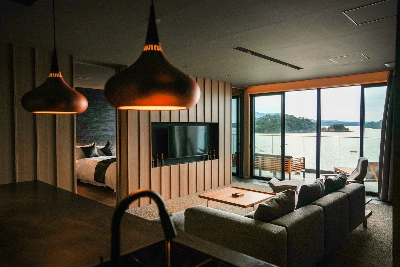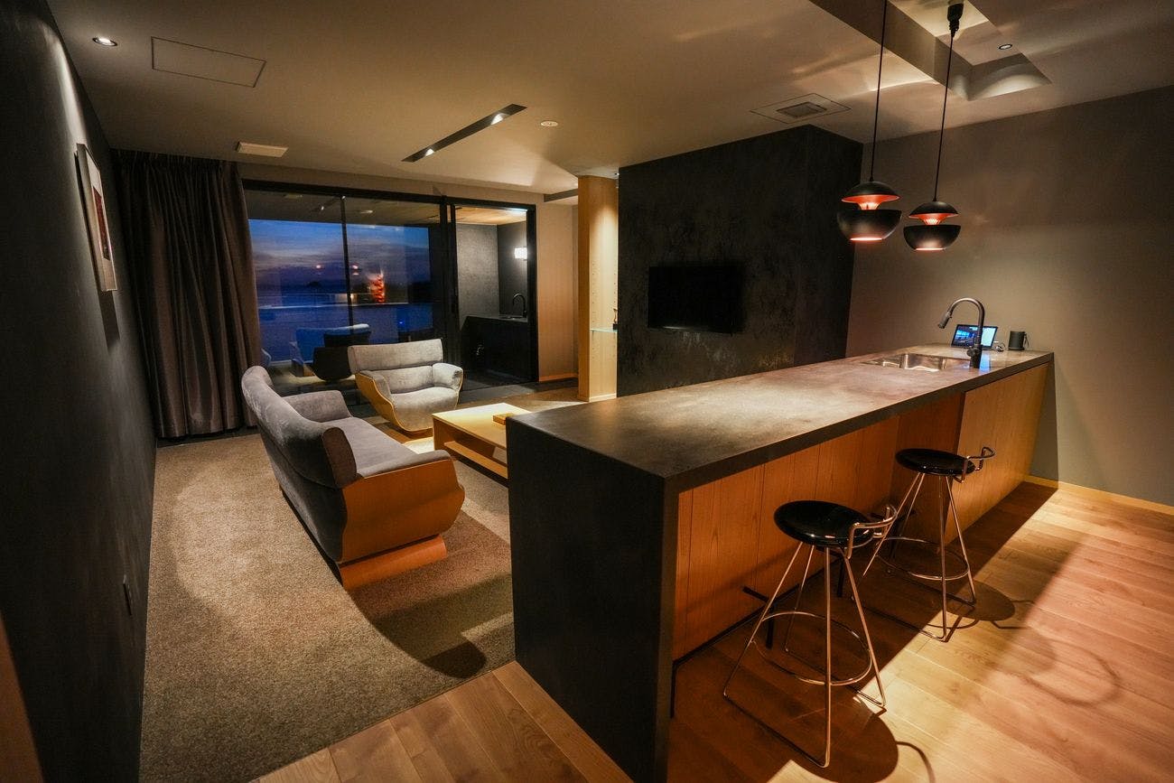 初めて宿泊させていただきましたが、細部までこだわりを感じる内装や充実したフリードリンクなど、非常に感度の高いお宿で感動いたしました。特に半露天の窓がガルウイングのように開く設えは、デザイン性も高く大変格好よかったです。事前に口コミを拝見して少々不安もありましたが、良い意味で期待を裏切る素晴らしい滞在となりました。大好きな鮨を絶景のカウンターで堪能できる趣向は、私にとって何よりの価値です。スタッフの皆様の丁寧な接客に加え、板前さんの謙虚なお人柄や、若い方々がひたむきに励まれる姿も非常に印象的でした。ぜひまた伺わせていただきます。