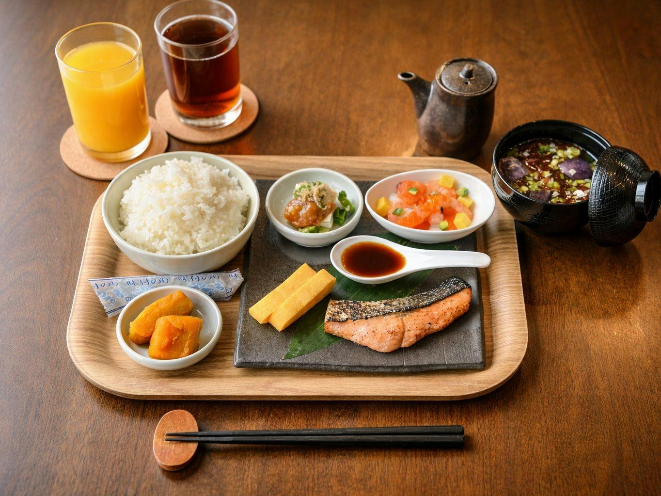 朝食は、和洋を中心とした内容で、一日の始まりを心地よくお迎えいただけるようご用意しております。なお、ご宿泊人数や仕入れ状況等により、提供形式がビュッフェからセットメニューへ変更となる場合がございます。その場合も、品質や満足度に配慮した内容でご提供いたします。