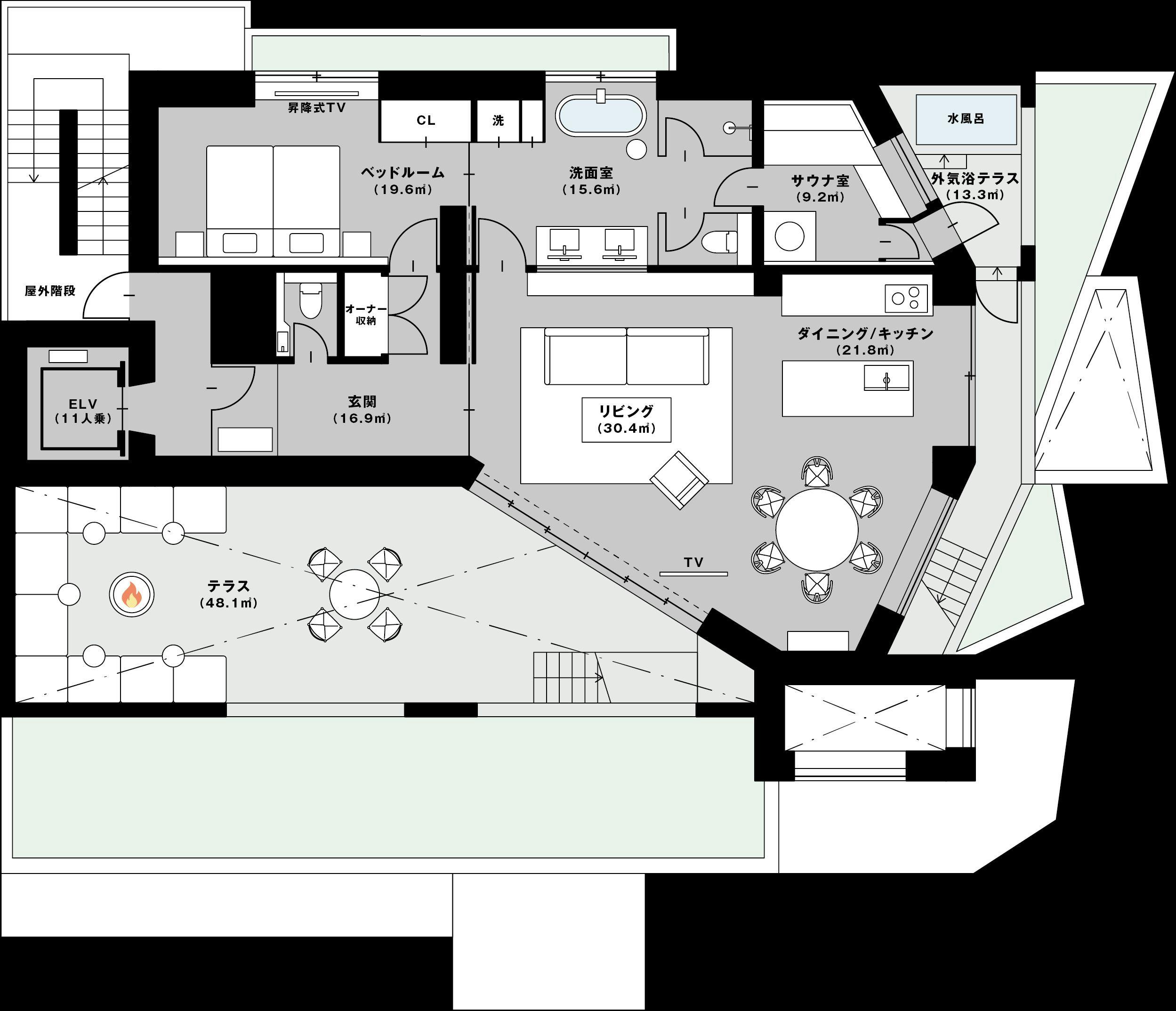 都会的な造形でありながら緑豊かな建築の中に、お部屋は全8室。全て100平米以上のゆとりある空間で、自分だけのプライベート時間を自由に楽しめます。8部屋それぞれコンセプトや設備が異なるので、お部屋選びからぜひお楽しみください。