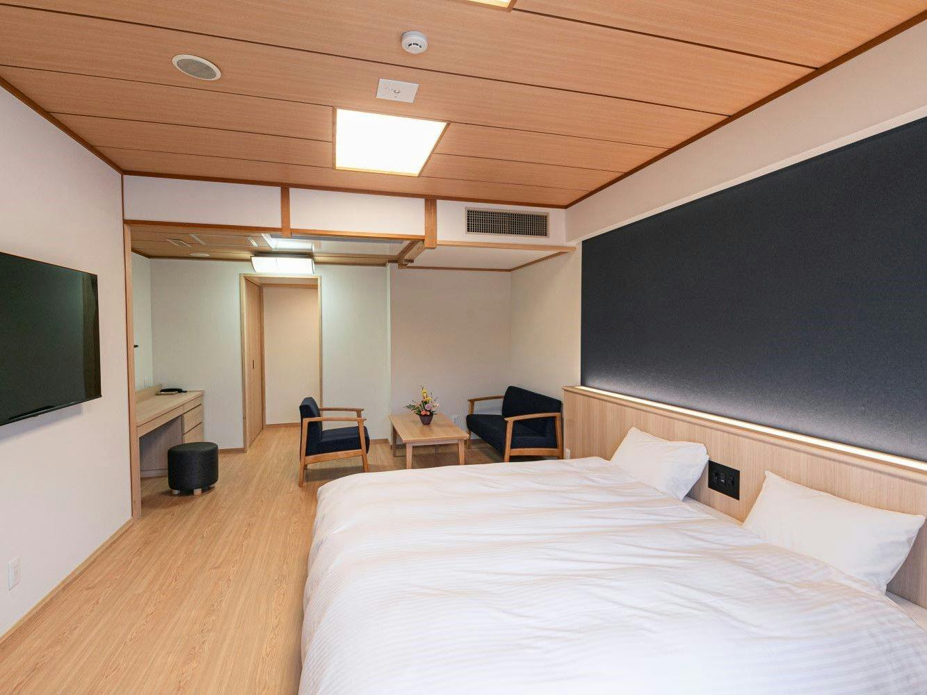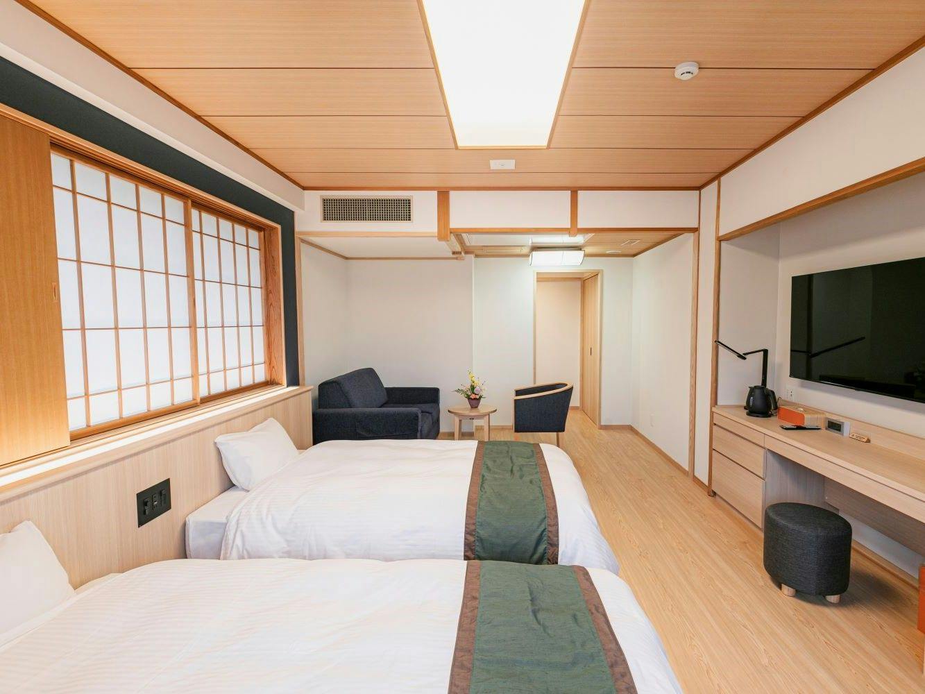 ダブルのお部屋でしたが2024年改修のおかげで広々していて綺麗で本当に楽しい宿泊でした。温泉とお茶と湯豆腐目当てでお泊まりしましたが、、料理もとても美味しく、サービスされるタイミングも本当に絶妙で、お皿が空になったと思った瞬間に次の一皿が出てくるのは本当にびっくりでした。スタッフの気遣いと笑顔が何より素晴らしく本当にありがとうございました。久々に星5を付けたくなるお宿でした。