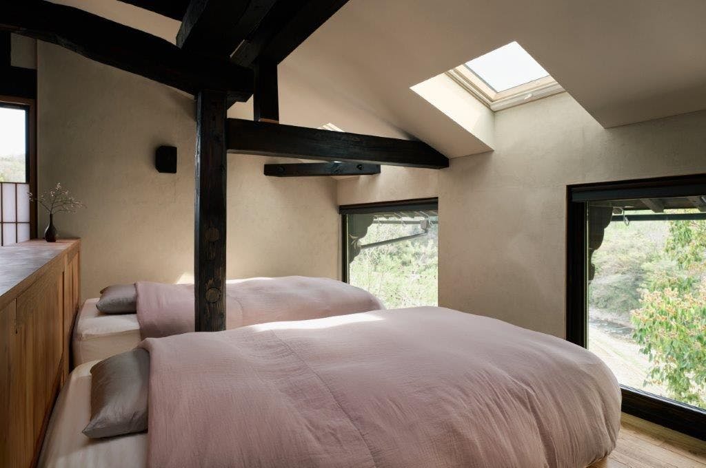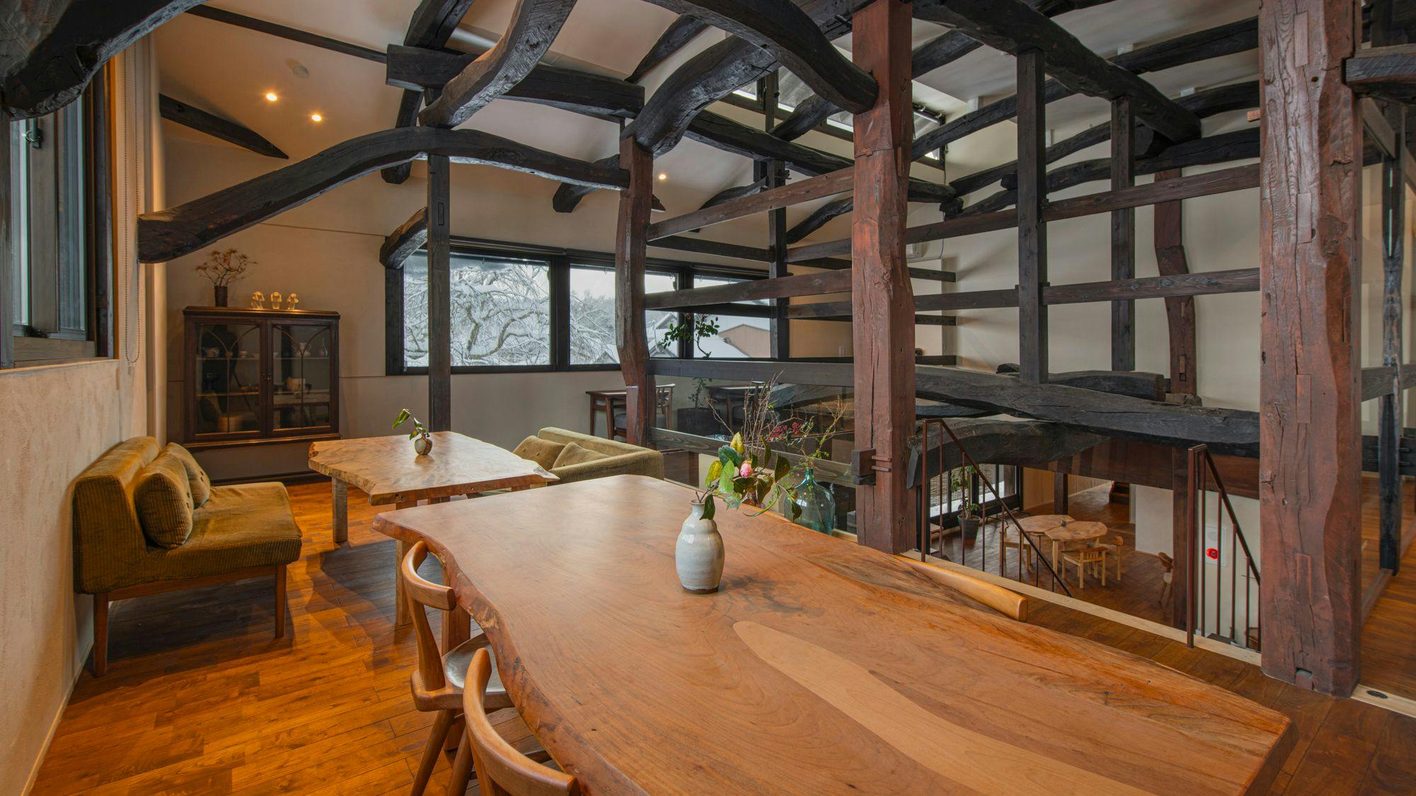 Onsen & Garden 七菜は、奥飛騨温泉郷の博物館として使用されていた古民家を移築した、築200年を超える歴史を持つ特別な古民家です。この移築は、単なる物理的な移動ではなく、古材の持つ悠久の歴史と、現代の洗練されたデザインが見事に融合した、唯一無二のアートピースとして新たな命を吹き込むプロセスでした。 一歩足を踏み入れれば、まず目に飛び込むのは、奥飛騨の厳しい自然を耐え抜いてきた、太く力強い梁や、長い時を経て深みを増した柱。これらは、かつての博物館時代に静かに時を刻んできた面影を残しつつ、現代的な光の取り入れ方や空間の広がりによって、息をのむほど美しいコントラストを生み出しています。計算された照明デザインは、床や壁、木材の質感を際立たせ、時間とともに表情を変える光と影の移ろいを愉しめます。 客室は、それぞれの個性を持ちながらも、シンプルで洗練されたデザインです。過度な装飾を排し、厳選された上質な素材と、飛騨の家具職人がこの宿のために手掛けた逸品が、心地よい調和を生み出しています。テレビを設置せず視覚的なノイズを排除することで、窓の外に広がる里山の景色や、空間そのものが持つ静謐な美しさ、そして大切な人との会話に、より深く集中できる環境を創り出しています。 バーカウンターに鎮座する数千年もの時を超えた「神代杉」の一枚板は、当館の象徴です。自然の壮大さと、それを現代空間に昇華させるデザインの力が融合した、忘れがたい美しさです。 Onsen & Garden 七菜の古民家は、日本の伝統美と現代デザインが織りなす芸術空間であり、訪れる人に深い感動と心の平穏をもたらす非日常空間です。