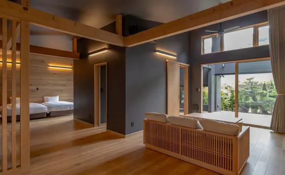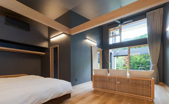 職人こだわりの木製家具や信楽焼の風呂桶。地元随一の庭師が丹精込めて作り上げた庭園。それぞれのクラフトマンシップが織り成す特別な空間・時間を、 7c wineryのワインとともにご堪能ください。窓の位置や天井の高さにも細やかな配慮が施され、お部屋からは神々しい山々の稜線と空の景色をお楽しみい ただけます。木の温もりに包まれた心地よい空間で、豊かな時間をお過ごしください。