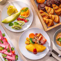 毎日お届けする朝食ビュッフェでは、厳選した旬の国産⻝材を取り入れたバラエティ豊かな和・洋のメニューとともに、シェフが目の前で仕上げるライブステーションをご用意しています。大きな窓から自然光が差し込む明るく開放感のある店内で、ゆったりとした朝のひとときを過ごし、穏やかな気持ちで一日をお迎えください。