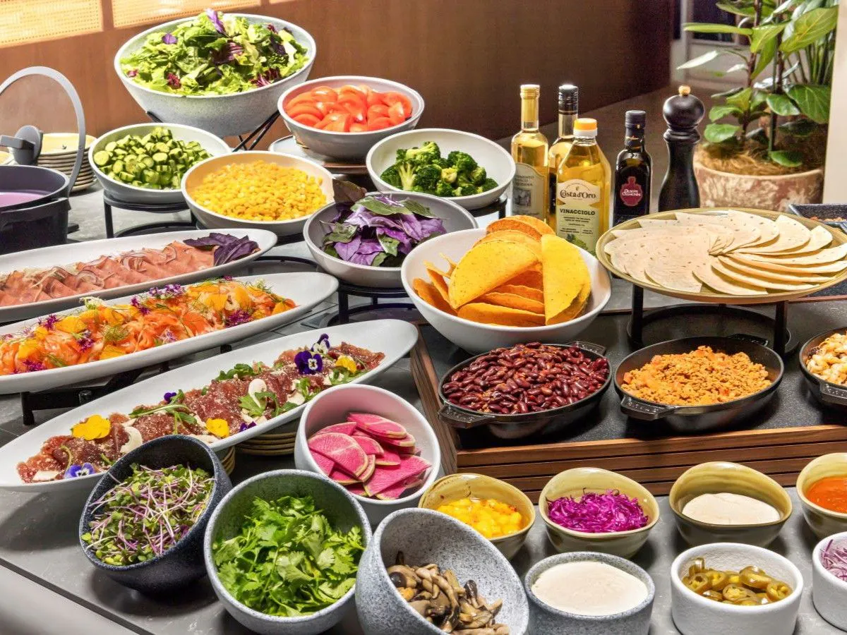タコスミートやシーフードに加え、マンゴーサルサやワカモレなど10種類以上のトッピングをご用意しました。ライスに盛り付けて、沖縄名物「タコライス」として味わうのもおすすめです。