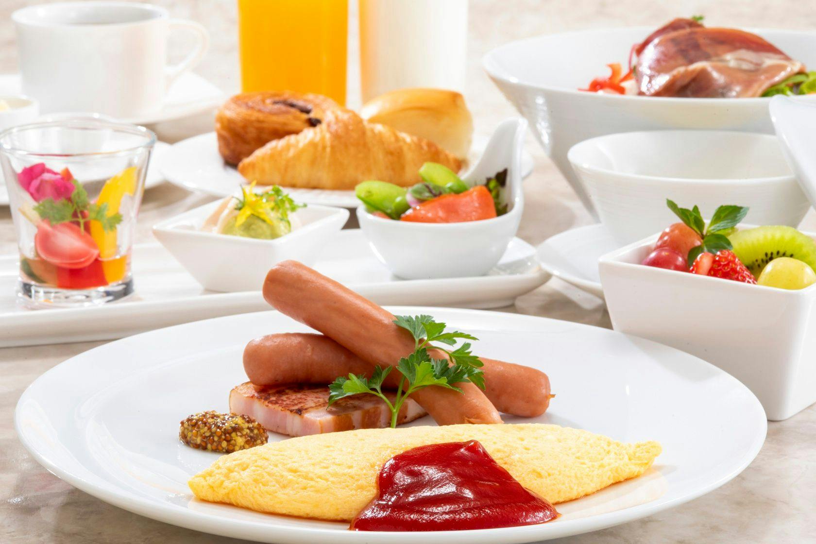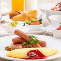 | 朝食 | 地元産の卵料理やソーセージ、ベーコンのプレート、30品目のサラダなど色鮮やかな洋食メニュー。 |