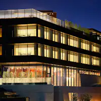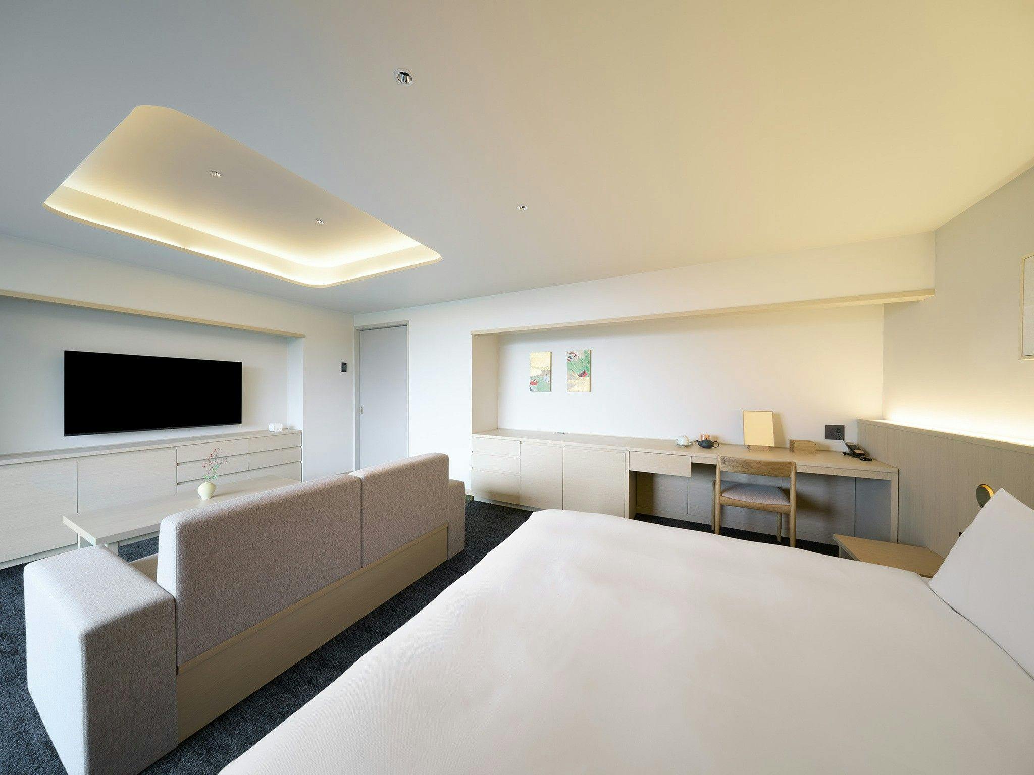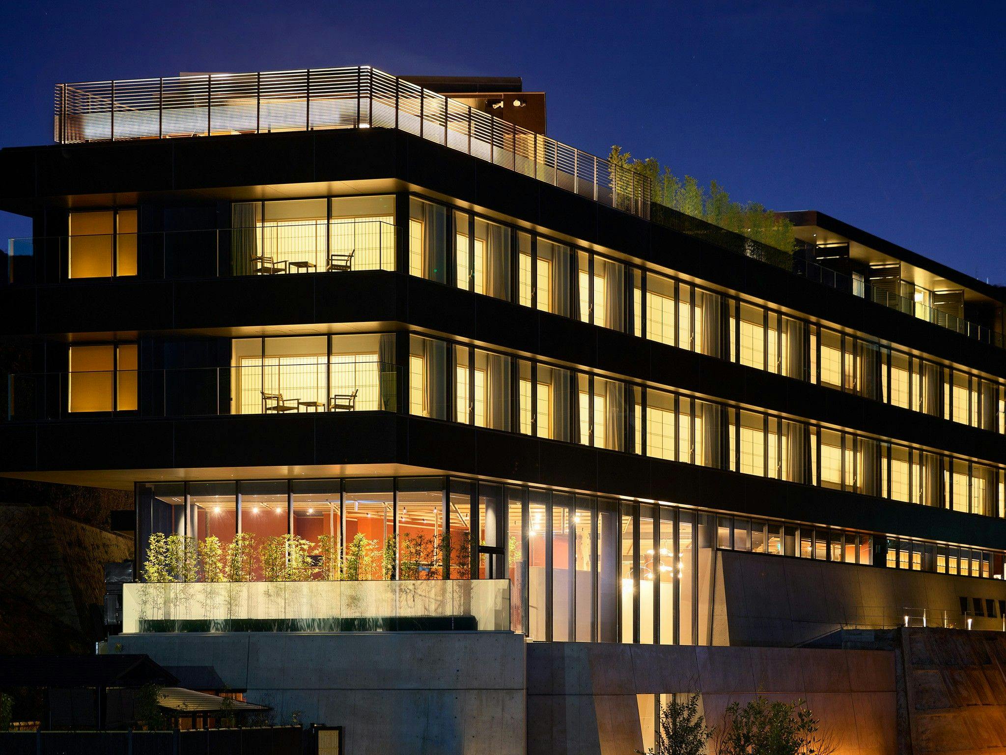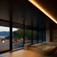 建築家 佐野文彦が設計したこのホテルは、古き良き日本の建築美とモダンな意匠が融合した空間です。 歴史と現代の感性が共鳴するデザインが、訪れる人々に上質な滞在体験と深い感動をもたらします。 ―DESIGN― デザインには、広島の文化や歴史を感じられる要素が随所に散りばめられています。その象徴のひとつが、ホテルエントランスロビーに広がる「能舞台」をモチーフにしたギャラリースペース。 国の重要文化財である厳島神社の能舞台から着想を得て、天井からは、広島県でつくられた提灯の照明がやわらかな光を放ちます。定期的に展示作品を入れ替えることで、訪れるたびに新しい出会いと発見をお届け。 この空間は、日本の美と宮島の文化を五感で感じられる、ホテルを象徴する場所のひとつです。