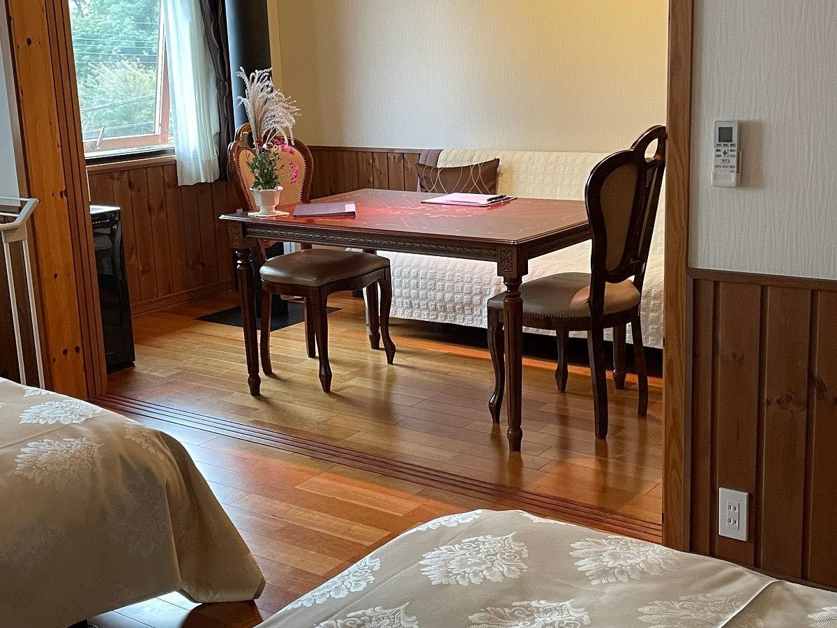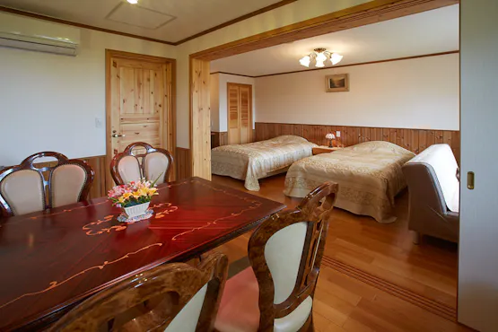 1フロアー約70平米。広々としたスイートルームの客室。 2階のワンフロアー約70平米が全て客室となっており、リビング、大室温泉を引いたモダンなバスルーム、 広めのパウダールーム、ゲストルームはツインベッドを備えたお部屋を2部屋ご用意しております。