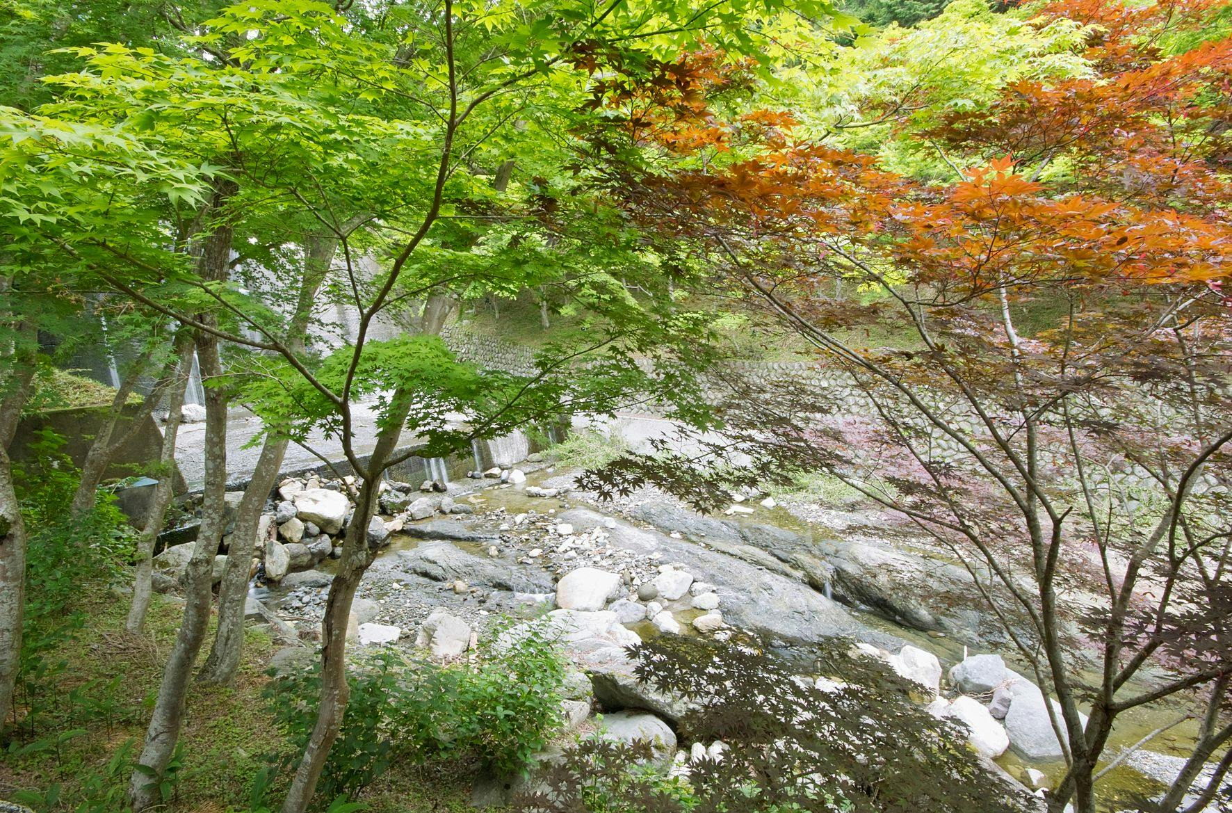 露天風呂など、6つのお風呂からの眺めは、深い山と清冽な川。自然満喫の園内散策と、お部屋でのおくつろぎで、心と身体が癒されます。