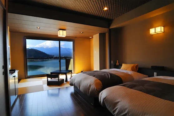 静かな時をあたえる客室は、和室と和洋室のしつらえ。全客室から雄大な富士をお楽しみいただけます。紺碧に染まる河口湖の鏡の水面と、優雅にそびゆる霊峰とを借景に柔和な四季の自然美をお楽しみください。