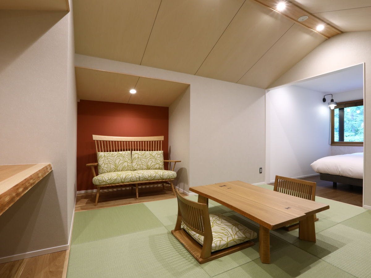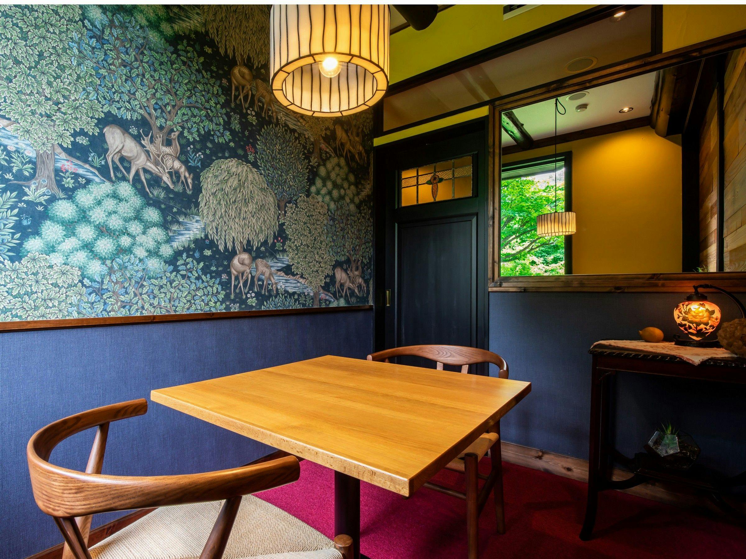 くにころ 2025/9/13炎熱の下界から涼風の高原へ。何軒かの宿泊施設が集まった林の中に宿はあります。古くからあるそうですが丁寧で上質なリフォームの成果で明るく清潔で過ごしやすい屋内です。盛夏の真昼のほんの短時間だけのためにエアコンを新設したとのことです。落ち着いたインテリアに楽しい置物がそこここに飾られオーナーの趣味がうかがえます。浴室棟の貸切風呂はかつての男女の大風呂らしく、大きな四角い石の湯舟と同じくらいの露天浴槽、2つの洗い場を備えています。始終適温です。風呂上がりの地ビールは美味でした。夕食は林の緑を眺める、窓の広い個室。手の込んだ美食。美食と地元ワインとのマリアージュを飲みすぎ、セルフカフェでのバータイムを逸しました。夜は静かです。寝居心地のいい寝具です。少し窓を開けて、高原の夜の空気のなかで眠りました。朝は鳥の声で目が覚めます。上手な鶯が引っ切り無しに鳴いています。早朝の温泉も夕方とは別の趣。朝食の和食の地物野菜も丁寧に調理されていました。オーナーとスタッフの接客が素晴らしい宿です。