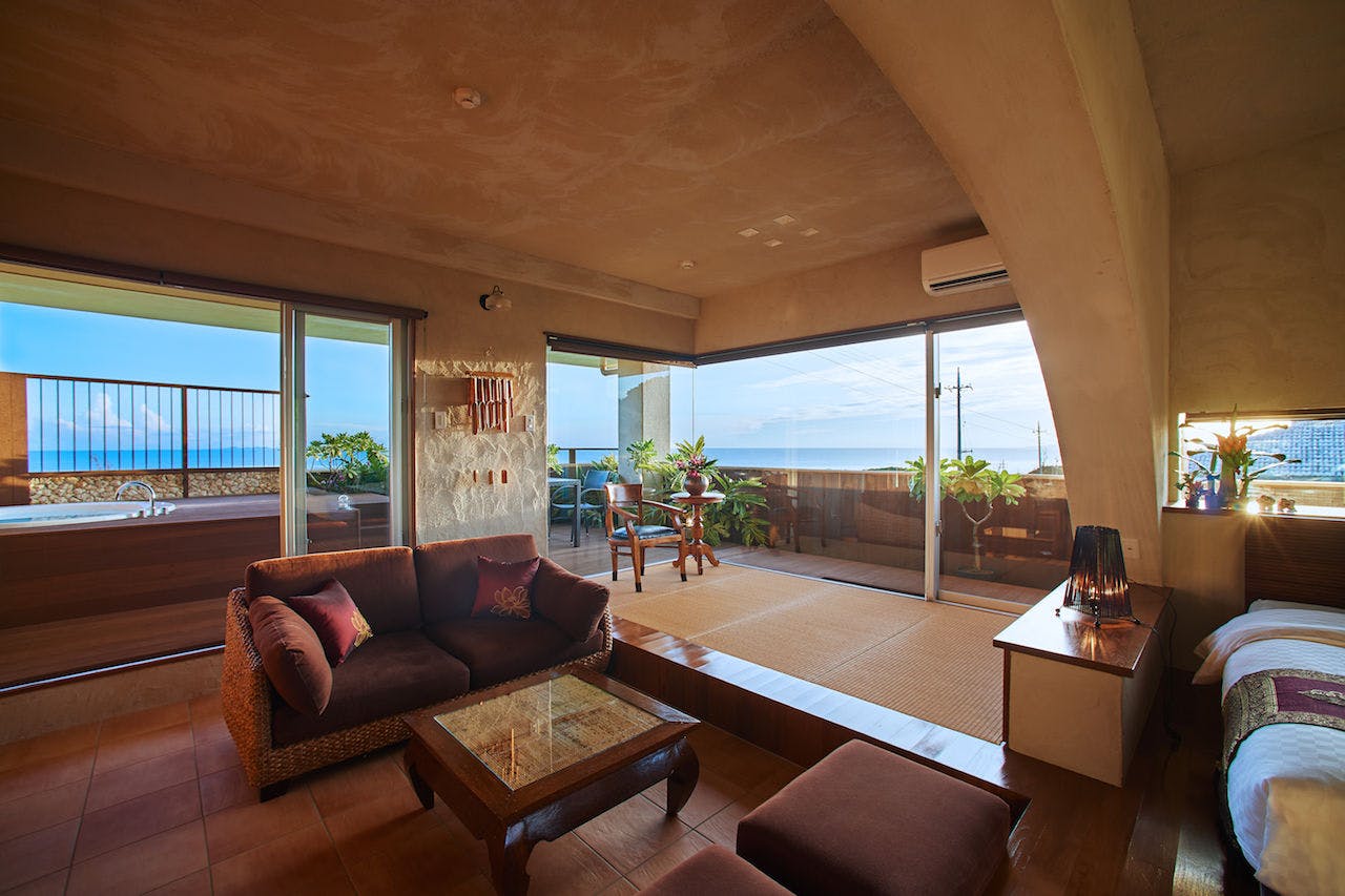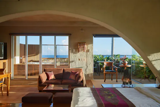 古宇利島の北側に位置する1日1組限定の宿。客室は随所に沖縄テイストを感じる56平米のジュニアスイート。テラスからは南国の花々や豊かな自然を、ジャグジー付き海側テラスからは美しい東シナ海を望めます。