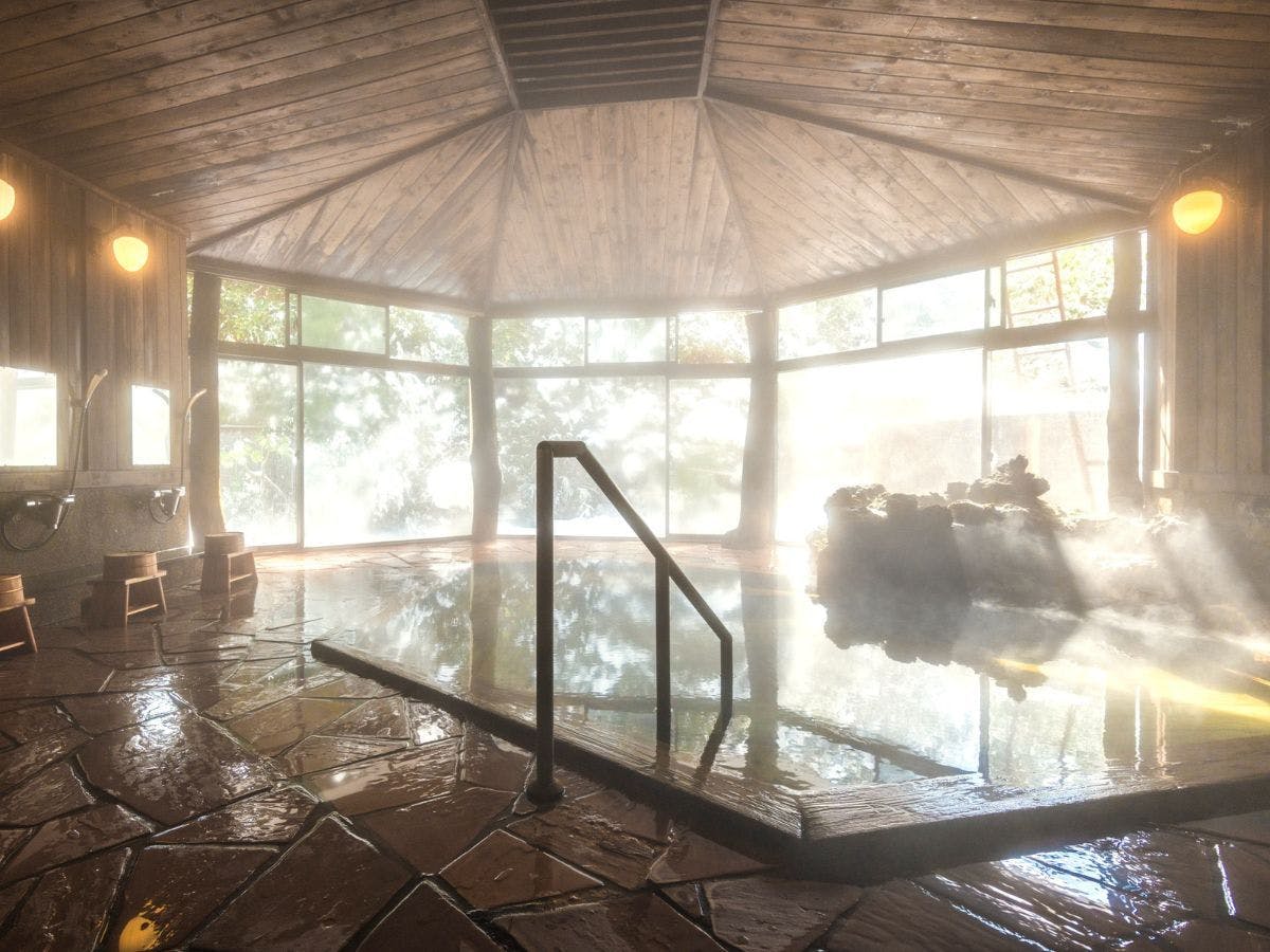 1200年前の開湯以来、湧き続ける肌にやさしい滑らかな湯。 源泉かけ流し温泉は、湯船に注がれる頃には心地よい適温となり、肌にやさしい滑らかな湯を楽しめます。 総ヒノキ造りの湯船は、優しい香りに包まれた癒しの空間。壁や床、天井にもヒノキを使用し、洗い場には自然石を敷き詰めております。 天然素材にこだわった空間・心安らぐ加水・加温なしの100%源泉を是非お楽しみください。