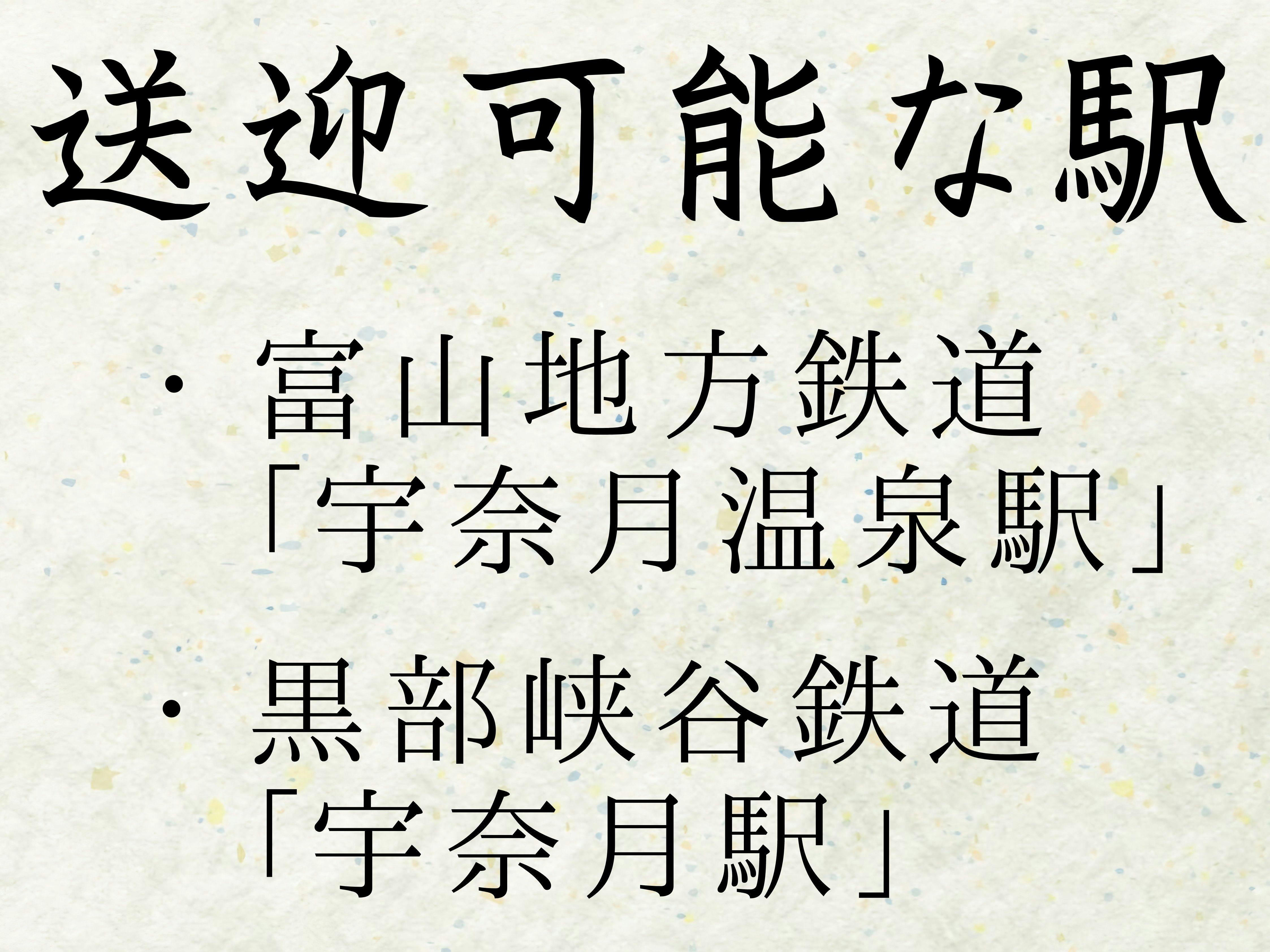 - あり(無料)富山地方鉄道宇奈月温泉駅から無料送迎4分