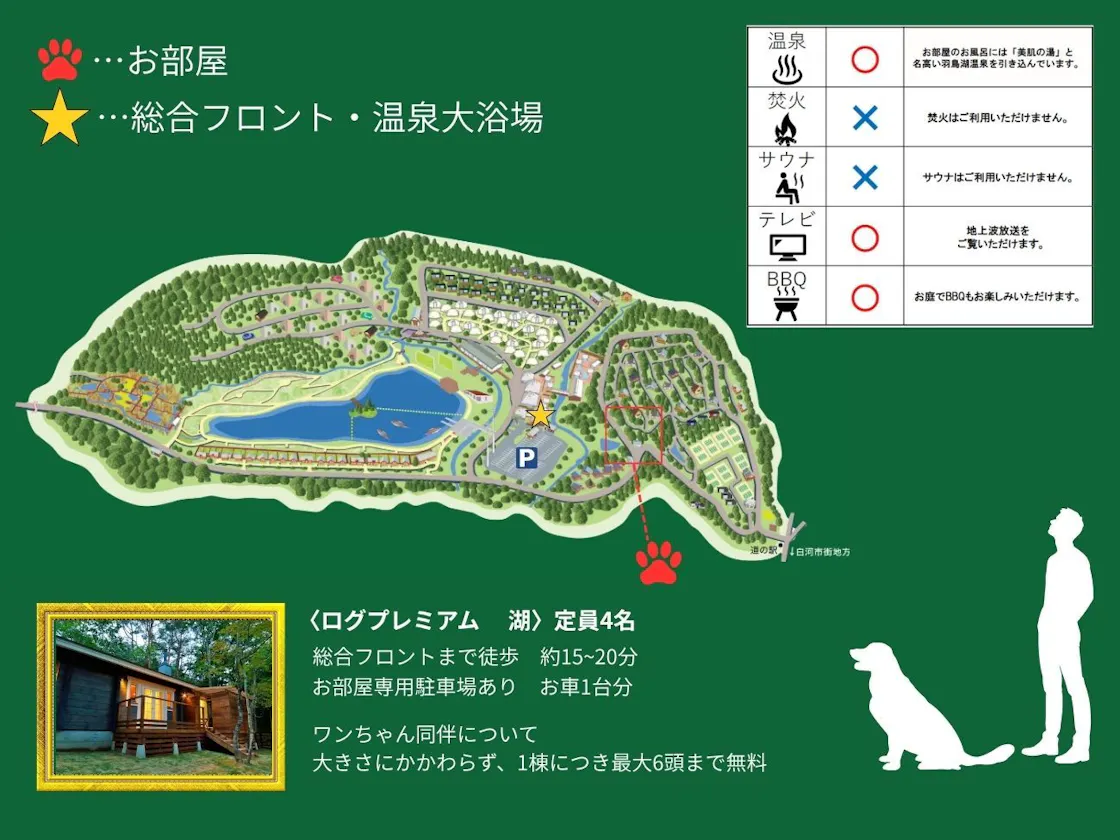 広さ:94平米 定員:4名 リビング+ダイニング+洋室2ルーム+キッチン+ランドリー+客室温泉+ドッグラン付 ================================ 【ワンちゃんのご宿泊について】 ●最大頭数:サイズ問わず6頭まで ●施設利用料:無料 ================================ 室設備:Wi-Fi完備・冷蔵庫・大型4Kテレビ・ドライヤー・、洗濯機、掃除機、調理器具(鍋類、炊飯器、オーブンレンジ)・洗濯用洗剤、柔軟剤・食器類(茶碗、皿類、グラス、はし等)・食器用洗剤・ふきん・タオル・シーツ・シャンプー・リンス・石鹸類・冷暖房・ウォッシュレット付トイレ等 ・洗面・バスルーム(天然温泉)・脱臭機・プライベートドックラン・ わんちゃん用客室備品:サークル(1台)※サークルの追加はございません。・トイレ(1台)、トイレシート(6枚)、専用バスタオル(2枚)、専用足拭きタオル(2枚)、専用食器(大・小)、フローリングワイパー、コロコロローラー、除菌消臭スプレー、散歩用ウンチ袋、愛犬用ゴミ箱 ※愛犬用食器・トイレシートの追加はフロントでの販売となります。 ・愛犬用食器(2枚1組) 540円(税込) ・トイレシート(5枚1組) 100円(税込)