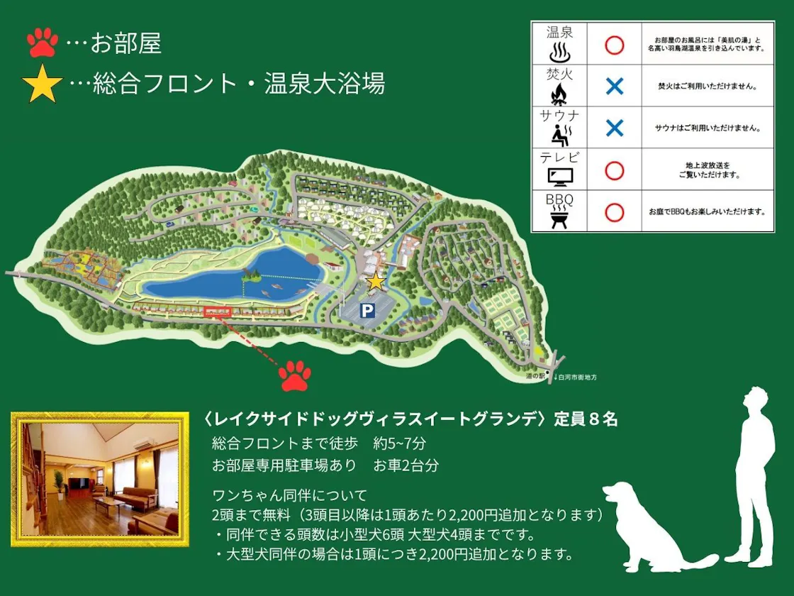 コテージタイプの客室なので必要以上に周りに気兼ねすることもなく快適にお過ごしいただけます。 「源泉かけ流しの客室温泉」付き。大きな窓から沢山の光が入り込む「半露天」湯舟につかりながら美肌の湯「羽鳥湖温泉を心ゆくまでご堪能いただけます。 客室面積はゆとりの125平米、広々リビングには室内でもたっぷり走り回れるスペースを確保しました。 ================================ 【ワンちゃんのご宿泊について】 ●最大頭数:サイズ問わず6頭まで ●施設利用料:2頭まで無料、3頭目以降1頭につき2,200円/1泊 ●大型犬(体高50cm以上)施設利用料:1頭につき2,200円/1泊 ================================ 広さ:約125平米 ドッグラン約112平米 備品:テレビ、冷蔵庫、電子レンジ、湯沸かしポット、冷暖房、脱臭機、バス、トイレ、洗面 アメニティ:パジャマ、バスタオル、ハンドタオル、スリッパ、シャンプー、コンディショナー、ボディソープ、クレンジング、乳液、歯ブラシ、髭剃り、ブラシ、ヘアドライヤー、懐中電灯、傘 ワンちゃん備品:バスタオル、足拭きタオル、ウェットティッシュ、モップ、粘着ローラー、トイレシート、トイレトレー、除菌消臭スプレー、散歩用ウンチ袋、散歩用消臭液、ケージ(クレート)、食器、おやつ類