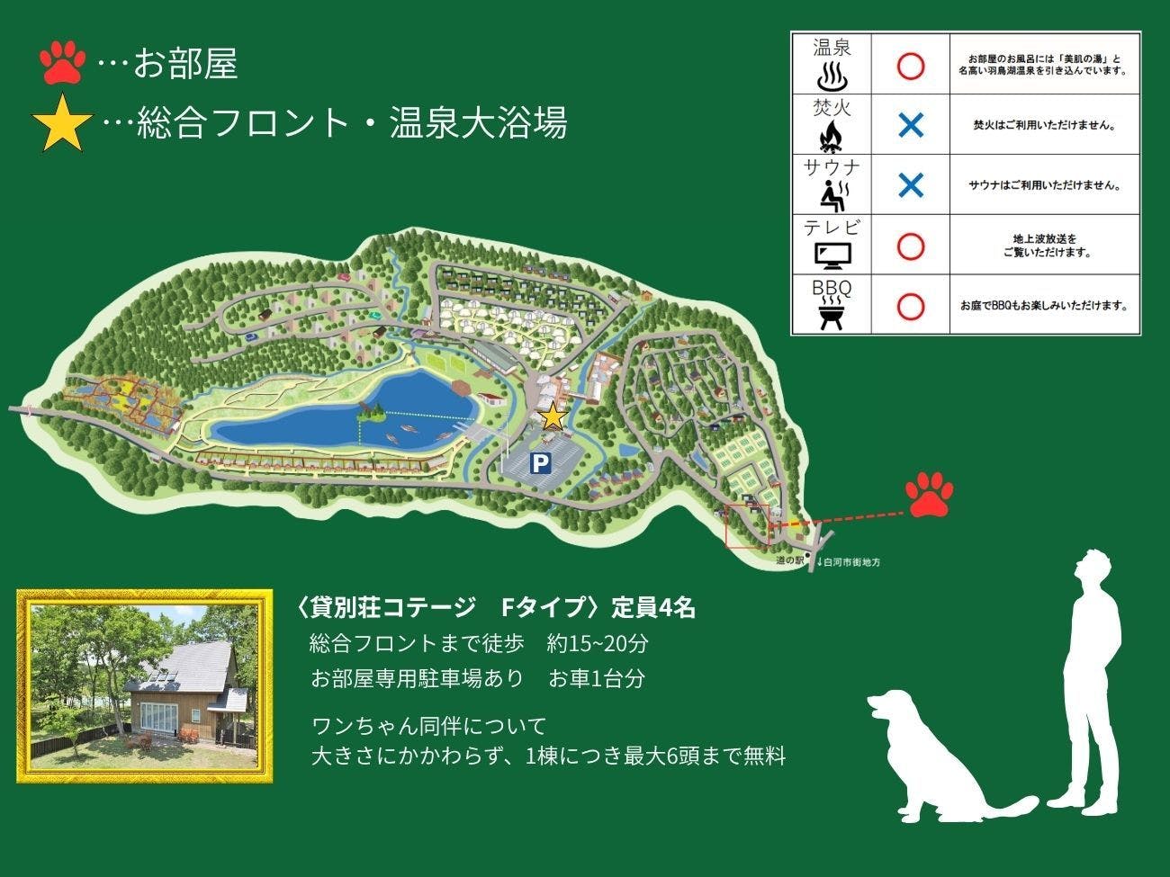 1泊2食 コテージBBQ付きのプランです。 夏季期間:4月中旬~10月頃 お品書き一例 ・福島県産牛 80g ・福島県産豚 80g ・ヤーコンフランク 1本 ・3種のつくね串 1本(人参、アスパラ、筍) ・野菜(筍、人参、ピーマン、かぼちゃ、アスパラ) ・焼きそば(麺120g、キャベツ、もやし、ソース) ※上記は1人前の分量です。 ※仕入れ状況により内容が替わる場合があります。 ご夕食 お部屋にて「BBQコース」 ご朝食 レストランでの朝食バイキングorモーニングボックス ■ワンちゃんの受入数・追加料金について■ コテージごとに規定がございます。 各コテージの詳細情報をご覧いただくか、施設に直接お問い合わせください。 ※ワンちゃん以外のペット(猫や小動物)はドームコテージカウラをご利用いただけます。 ■ご宿泊特典 彩光の湯がご利用いただけます。 タオルは客室へのご用意となります。 チェックイン前、チェックアウト後に「彩光の湯」をご利用の場合は、 タオルのご用意が出来ませんのでご持参いただきますようお願いいたします。 平日(月~金曜日)は11:00から15:00まで清掃時間の為ご利用いただけません。 ■当館のコンセプト 当館は“愛犬と一緒に泊まれるコテージリゾート”をテーマにありのままの大自然を活かし、多彩な施設が点在する複合リゾートホテルです。 もちろん愛犬がいなくても、カップルやご家族でも楽しめるアクティビティなども充実しておりますので様々なシーンでお楽しみいただけます。 ■東北初!“snow peak”直営店が館内に ギアやアパレルなどのおなじみのアウトドア用品に加えて、フライフィッシング関連用品、アウトドアクロージング、ドッグアクセサリーの販売も行っております。また、ショップ内にはカフェ「Snow Peak Cafe SHIRAKAWA KOGEN」も併設し、焼き立てパンや自家製アウトドアカレーライス、紅茶などを提供し大自然の中でゆっくりと過ごしていただけます。 ■ph値9.7アルカリ泉質の天然温泉や屋外ログハウスサウナも設備 アルカリ泉質の天然温泉「彩光の湯」と屋内プールや水着着用スパ施設「ガーデンスパ」(期間限定)、そして本場フィンランドの雰囲気が楽しめる森のサウナ「カベリ」が屋外にあり、こちらもお楽しみいただけます。 ■園内で楽しめる様々なアクティビティもご用意 約2万匹の魚が回遊する国内でも最大級のフィッシングや、カナディアンカヌー、レンタサイクル、テニスなどのスポーツアクティビティはもちろん、スノーシーズンは湖畔でのソリ、オールシーズンでお楽しみいただけけます。 【チェックイン・アウト時間について】 通常:15:00イン/10:00アウト グランピング:14:00イン/10:00アウト レイクサイドドッグヴィラ・ドームコテージ:15:00イン/11:00アウト ●ワンちゃんの記念日をエンゼルフォレスト白河高原でお祝いしませんか? ご宿泊日当月がお誕生日、またはうちの子記念日のワンちゃんに、お誕生日ケーキをプレゼント! ご予約時に「ワンちゃんのお誕生日旅行」である旨をご入力ください。 詳細はこちら→https://www.ang-sk.com/dog
