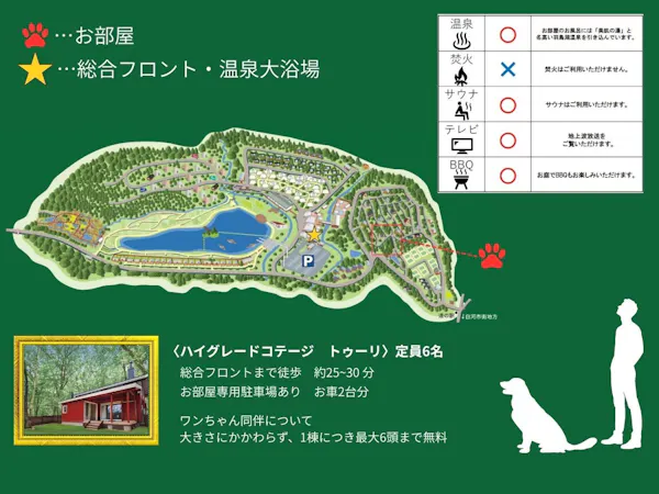 リビング+ダイニング+洋室2ルーム+和室1ルーム+キッチン+ランドリー+客室温泉 ================================ 【ワンちゃんのご宿泊について】 ●最大頭数:サイズ問わず6頭まで ●施設利用料:無料 ================================ 家具・電化製品(冷蔵庫、大型4Kテレビ、ドライヤー、洗濯機、掃除機)、調理器具(鍋類、炊飯器、オーブンレンジ)、食器類(茶碗、皿類、グラス、はし等)、食器用洗剤、ふきん、タオル、シーツ、シャンプー、リンス、石鹸類、洗濯用洗剤、冷暖房、ウォシュレット付トイレ、洗面、バスルーム(天然温泉)、脱臭機、 等 サークル(1台)、トイレ(1台)、トイレシート(6枚)、専用バスタオル(2枚)、専用足拭きタオル(2枚)、専用食器(大・小)、フローリングワイパー、コロコロローラー、除菌消臭スプレー、散歩用ウンチ袋、愛犬用ゴミ箱